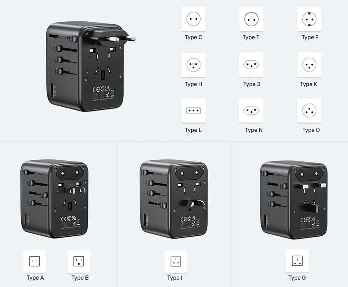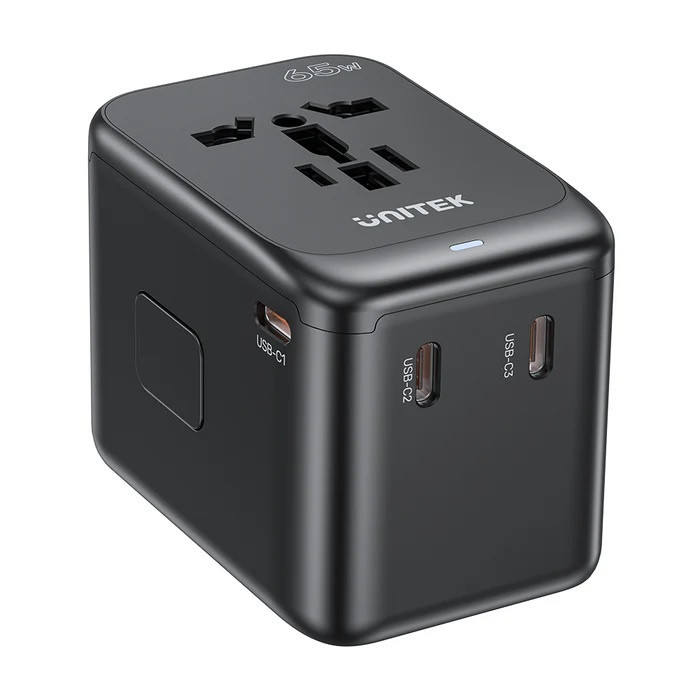 Adaptador de viaje universal UNITEK de 65 W con 3 puertos de carga USB-C PD (máximo de 65 W) y 1 puerto de carga USB-A QC 3.0 (máximo de 45 W) que puede cargar hasta 4 dispositivos simultáneamente. Es ideal para viajes, viajes de negocios o para estudiar en el extranjero. Los enchufes de viaje integrados se pueden utilizar en más de 200 países de todo el mundo.
