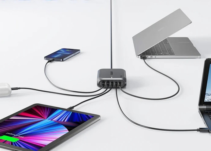 Cargador GaN de 5 puertos con soporte. Compatible con carga rápida y 140 W para MacBook Pro.
