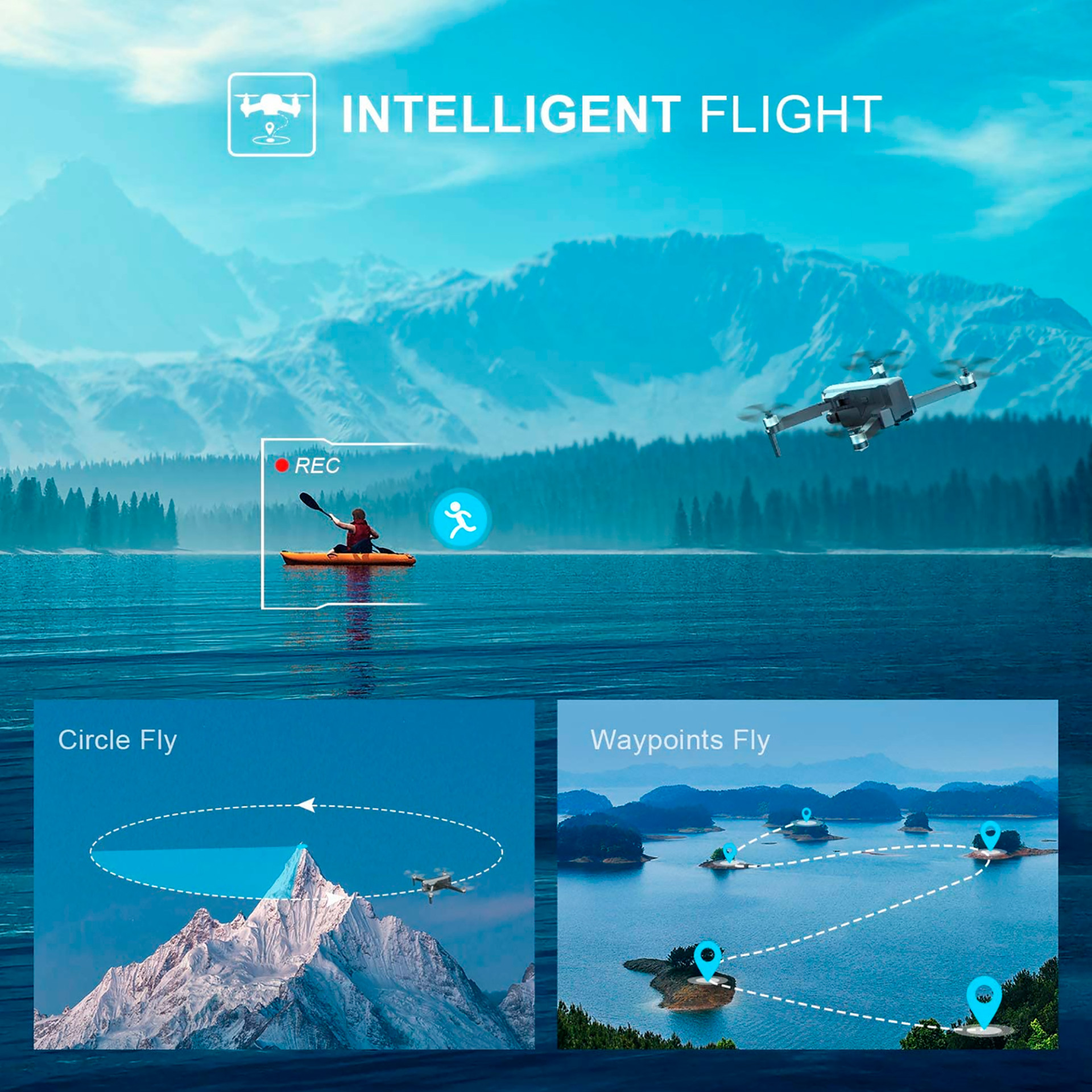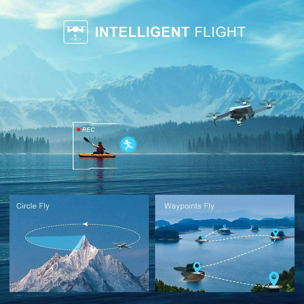 Inteligente y Divertido: FOLLOW ME permite liberar las manos para tomar fotografías complejas. CIRCLE FLY vuela alrededor de un punto en círculos. WAYPOINTS permite establecer una ruta personalizada.