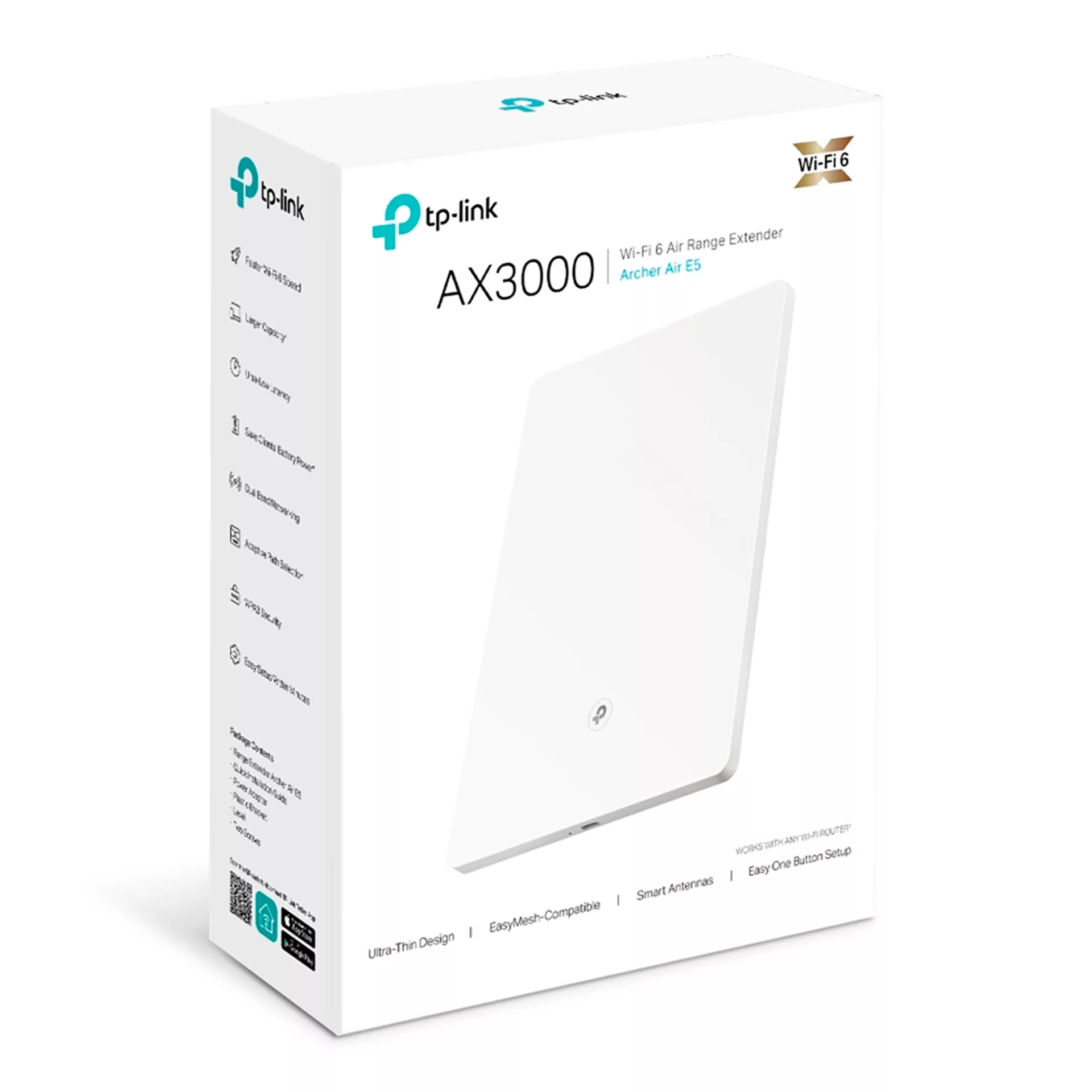 TP-LINK - EXTENSOR DE WIFIARCHER AIR E5Repetidor WIFI 6 AX3000 Ultrafino con Antenas Inteligentes.Velocidad WIFI 6 Gigabit.Hasta 574 Mbps en la banda de 2,4 GHz y 2402 Mbps en la banda de 5 GHz, garantizan una conexión estable y descargas más rápidas.Libertad de Instalación.Colócalo sobre un mueble o móntalo en la pared con adhesivos 3M.Antenas Inteligentes.Las antenas detectan los dispositivos conectados y se orientan hacia ellos automáticamente.Compatible con EasyMesh.Funciona con routers compatibles con EasyMesh para crear una red mesh en toda la casa.Fácil configuración.Con la App Tether podrás configurar las red WIFI 6 en pocos minutos desde el móvil.Frecuencia: 2,4 GHz / 5 GHz.Tasa de Señal: 574 Mbps a 2,4 GHz / 2402 Mbps a 5 GHz.Estándares Inalámbricos WIFI 6: IEEE 802,11 b/g/n/ax 2,4 GHz / IEEE 802,11 a/n/ac/ax 5 GHz.Cifrado WIFI: WPA3 / WPA2-PSK / WPA.Antenas: Internas.Requisitos del Sistema: WINDOWS 98SE o superior / MAC / NETWARE / UNIX / LINUX; INTERNET EXPLORER 11 / FIREFOX 12 / CHROME 20 / SAFARI 4 / otro navegador compatible con JAVA.Temperatura de Funcionamiento: 0 °C - 40 °C.Dimensiones: 210 x 148 x 8 mm APROX.Color: BLANCO.Link del Fabricante.Garantía: 1 año.Contra Defecto de Fabricación.