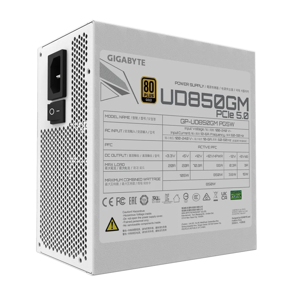 Gigabyte UD850GM PG5W - Fuente de alimentación (interna) - ATX12V 3.0 - 80 PLUS Gold - CA 100-240 V - 850 vatios - PFC activa