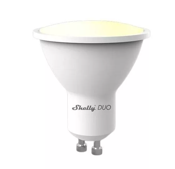 Lámpara LED Wi-Fi regulable con rosca GU10. Permite ajustar la temperatura de color entre blanco cálido y blanco frío (WW/CW) Regulable desde app Apta para uso diario Shelly Duo se puede configurar para que se encienda y apague automáticamente según la hora del amanecer y el atardecer No requiere HUB La bombilla admite fuentes de alimentación de 110 V y 220 V Luz blanca regulable mediante ajuste fino de brillo Se puede integrar para trabajar con todos los demás dispositivos Shelly Compatible con Android, iOS, Amazon Alexa, Google Assistant y servidores de automatización del hogar que utilizan MQTT, CoAP y API REST Potencia nominal: 5 W Filamento: LED Rosca: GU10 Fuente de alimentación: 100-240 V~, 50/60 Hz Brillo: Hasta 400 lm Atenuación: Sí Temperatura de color: 2700 K 6500 K Ángulo del haz: 120° Vidrio / Recubrimiento: Mate Clase de protección: IP20 Consumo de energía del dispositi