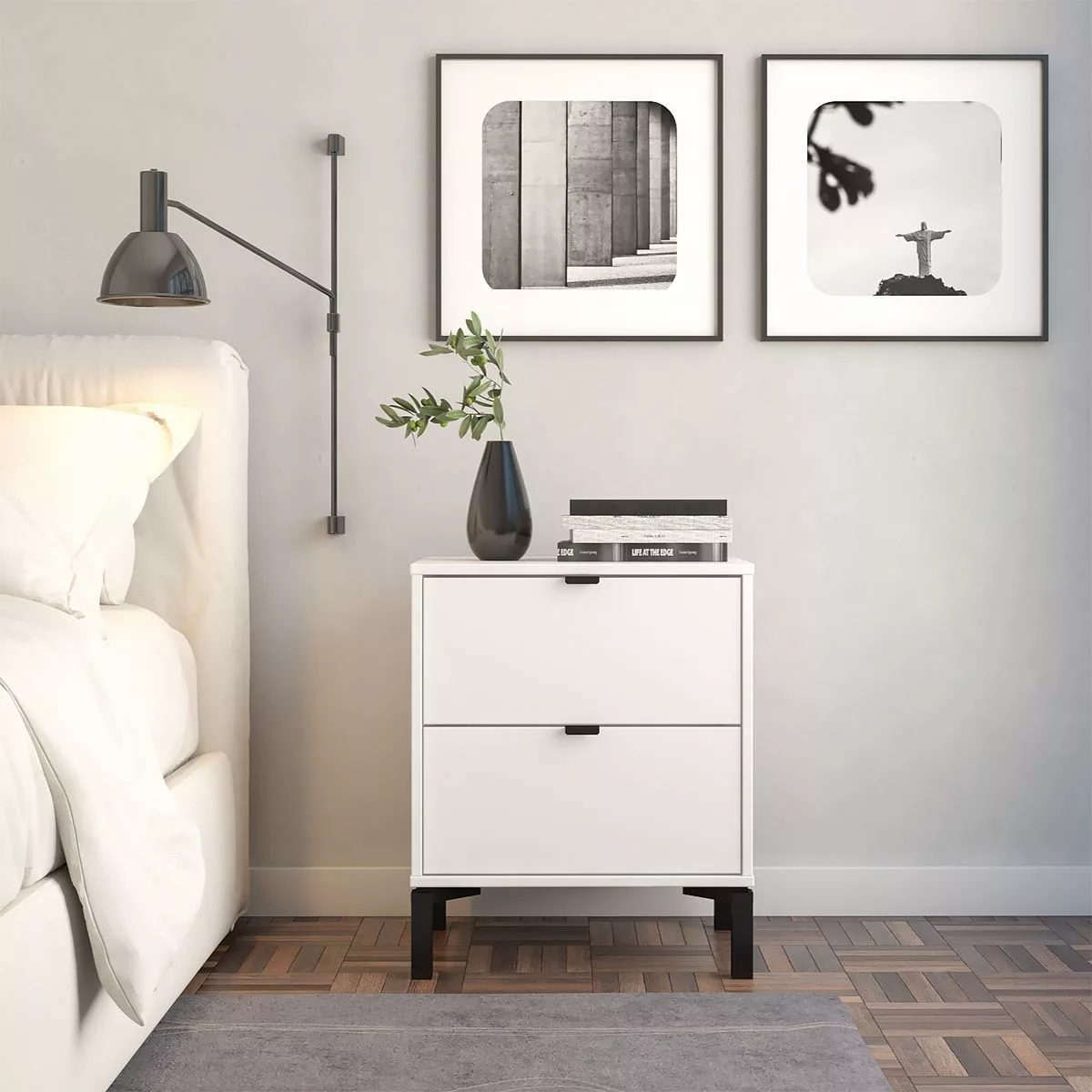 Esta mesa de luz tiene todo lo que necesitás: diseño moderno, altura ideal para camas más altas y cajones amplios para guardar todo eso que querés bien a mano y bien guardado a la vez. Fabricada en MDP con contrachapado melamínico, rieles telescópicos para un deslizamiento suave, patas en madera y tiradores metálicos, ambos detalles en color negro, aportan carácter y estilo con un toque de sofisticación. Una pieza funcional, simple y con mucha onda que eleva el estilo de tu dormitorio.
