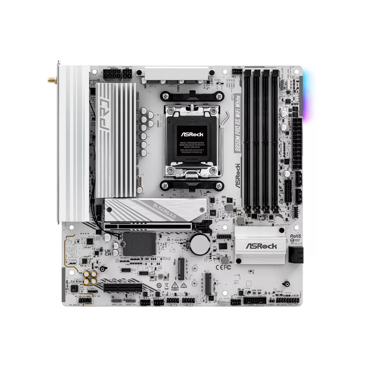 Marca Asrock Part Number B850M PRO RS WIFI WH 90-MXBT30-A0UAYAZ CPU - Soporta AMD Socket AM5 Ryzen™ 9000, 8000 y 7000 Series Processors* Chipset - AMD B850 Memoria - Dual Channel DDR5 Memory Technology - 4 x DDR5 ranuras DIMM - Soporta memoria DDR5 ECC/non-ECC, un-buffered up to 8000+(OC)* - Máxima capacidad de memoria del sistema: 256GB Gráficos Integrated AMD RDNA™ graphics (El soporte actual puede variar según la CPU) - 1 x HDMI 2.1 TMDS/FRL Compatible con 8G, Soporta HDR, HDCP 2.3 y max. Resolución up to 4K 120Hz - 1 x DisplayPort 1.4 con DSC (comprimido), Soporta HDCP 2.3 y max. Resolución up to 4K 120Hz Audio - Audio 7.1 canales HD (Realtek ALC897 Audio Codec) - Nahimic Audio LAN - 2.5 Gigabit LAN 10/100/1000/2500 Mb/s - Dragon RTL8125BG Ranuras de Expansión 1 x PCIe 5.0 x16 Slot (CPU), 1 x PCIe 4.0 x1 Slot (Chipset). Conectores - 1 x cabecera SPI TPM - 1 x LED de alimentación y header de altavóz - 1 x Encabezado RGB LED* - 3 x Encabezado LED direccionable** - 2 x conectores ventilador Procesador (4-pin) (Control de velocidad ventilador Smart Fan)*** - 3 x conectores ventilador caja (4-pin) (Control de velocidad ventilador Smart Fan)*** - 1 x conector alimentación 24 pin ATX - 1 x conector alimentación 8 pin 12V (Conector de Alimentación de Alta Densidad) - 1 x conector alimentación 4 pin 12V (Conector de Alimentación de Alta Densidad) - 1 x Conector panel frontal audio - 2 x cabezales USB 2.0 (soporta 4 puertos USB 2.0) - 2 x cabezales USB 3.2 Gen1 (soporta 4 puertos USB 3.2 Gen1) - 1 x Panel Frontal Tipo C USB 3.2 Gen1 Encabezado Panel trasero E/S - 2 x Puertos de antena - 1 x puerto HDMI - 1 x DisplayPort 1.4 - 1 x puerto USB 3.2 Gen2 Type-A (10 Gb/s) - 1 x puerto USB 3.2 Gen2 Type-C - 2 x puertos USB 3.2 Gen1 - 4 x puertos USB 2.0 - 1 x Puerto RJ-45 - 1 x Interruptor Flashback del BIOS - Conectores HD Audio: entrada de línea / Altavoz Delantero / Micrófono Formato Micro ATX Socket AM5 Almacenamiento - 1 x Blazing Socket M.2 (M2_1, Key M), Soporta type 2280 PCIe Gen5x4 (128 Gb/s) mode* - 1 x Hyper Socket M.2 (M2_3, Key M), Soporta type 2280 PCIe Gen4x4 (64 Gb/s) mode* Chipset: - 1 x Hyper Socket M.2 (M2_2, Key M), Soporta type 2280 PCIe Gen4x4 (64 Gb/s) mode* - 4 x conectores SATA3 de 6.0 Gb/s RAID - Soporta RAID 0, RAID 1 y RAID 10 for SATA Dispositivos de almacenamiento - Soporta RAID 0, RAID 1 y RAID 10 for M.2 NVMe Dispositivos de almacenamiento. Conectividad Inalámb Intel® Wi-Fi 6E AX210 (2x2), Bluetooth 5.2. Color Blanco