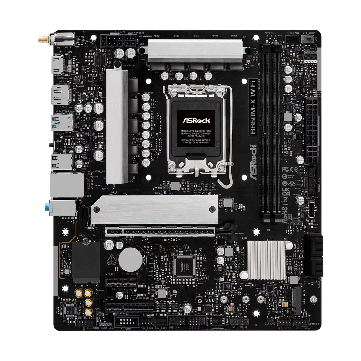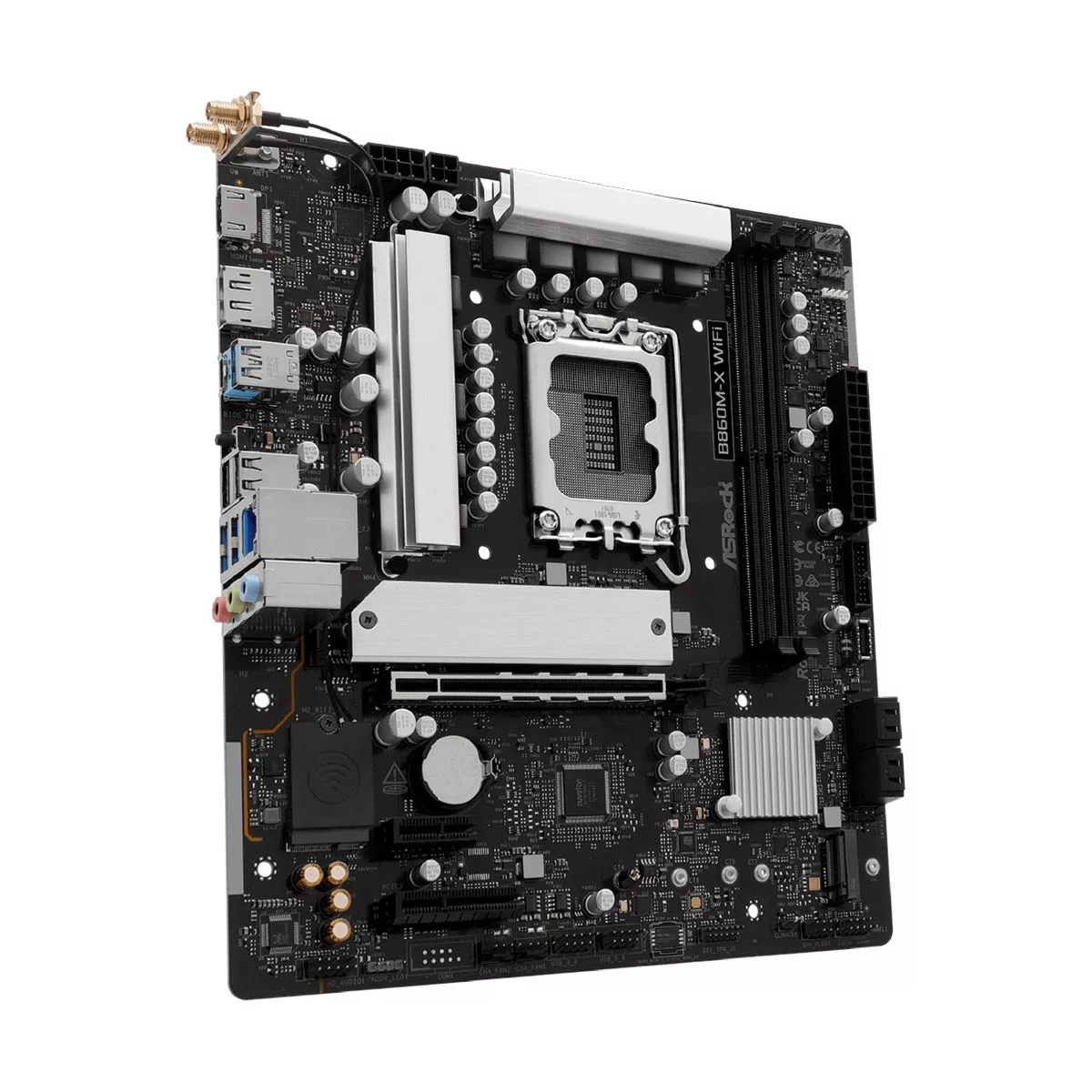 Marca Asrock Part Number B860M-X WIFI 90-MXBRY0-A0UAYAZ CPU Soporta procesadores Intel® 12th, 13th y 14th Gen (LGA1700) Chipset Intel® B860 Memoria - Dual Channel DDR5 Memory Technology - 2 x DDR5 ranuras DIMM - Soporta memoria DDR5 non-ECC, un-buffered up to 9066+(OC)* - Soporta Clocked Unbuffered DIMM (CUDIMM) - Máxima capacidad de memoria del sistema: 128GB BIOS 128Mb AMI UEFI Legal BIOS con soporte GUI. Gráficos Soporta gráficos integrados en CPU (Intel® Xe Graphics). Salidas: 1 x HDMI 2.1, 1 x DisplayPort 1.4. Audio Realtek ALC897 Codec, Audio HD de 7.1 canales. LAN Realtek Gigabit LAN (RJ-45). Ranuras de Expansión 1 x PCIe 5.0 x16 (desde CPU), 1 x PCIe 4.0 x1 (desde Chipset). Conectores 1 x Cabezal SPI TPM, 1 x Cabezal de intrusión de chasis y altavoz, 1 x Conector de ventilador de CPU, 1 x Conector de ventilador de CPU/bomba de agua, 3 x Conectores de ventilador de chasis/bomba de agua, 1 x Conector de alimentación ATX de 24 pines, 1 x Conector de alimentación de 12V de 8 pines, 1 x Conector de audio del panel frontal, 1 x Cabezal USB 2.0 (soporta 2 puertos USB 2.0), 1 x Cabezal USB 3.2 Gen1 (soporta 2 puertos USB 3.2 Gen1), 1 x Cabezal USB 3.2 Gen1 Type-C del panel frontal, 1 x Jumper Clear CMOS. Panel trasero E/S 2 x Puertos de antena, 1 x HDMI, 1 x DisplayPort 1.4, 4 x USB 3.2 Gen1 Tipo A, 1 x USB 3.2 Gen1 Tipo C, 2 x USB 2.0, 1 x Puerto LAN RJ-45, 3 x Jacks de audio. Formato Micro ATX (24.4 cm x 21.8 cm) Almacenamiento 2 x Ranuras Hyper M.2 (PCIe Gen4 x4), 4 x Puertos SATA3 6.0 Gb/s. RAID Soporta RAID 0, RAID 1, RAID 5, RAID 10 para dispositivos de almacenamiento SATA Conectividad Inalámb Wi-Fi 6E (802.11ax), Bluetooth 5.3