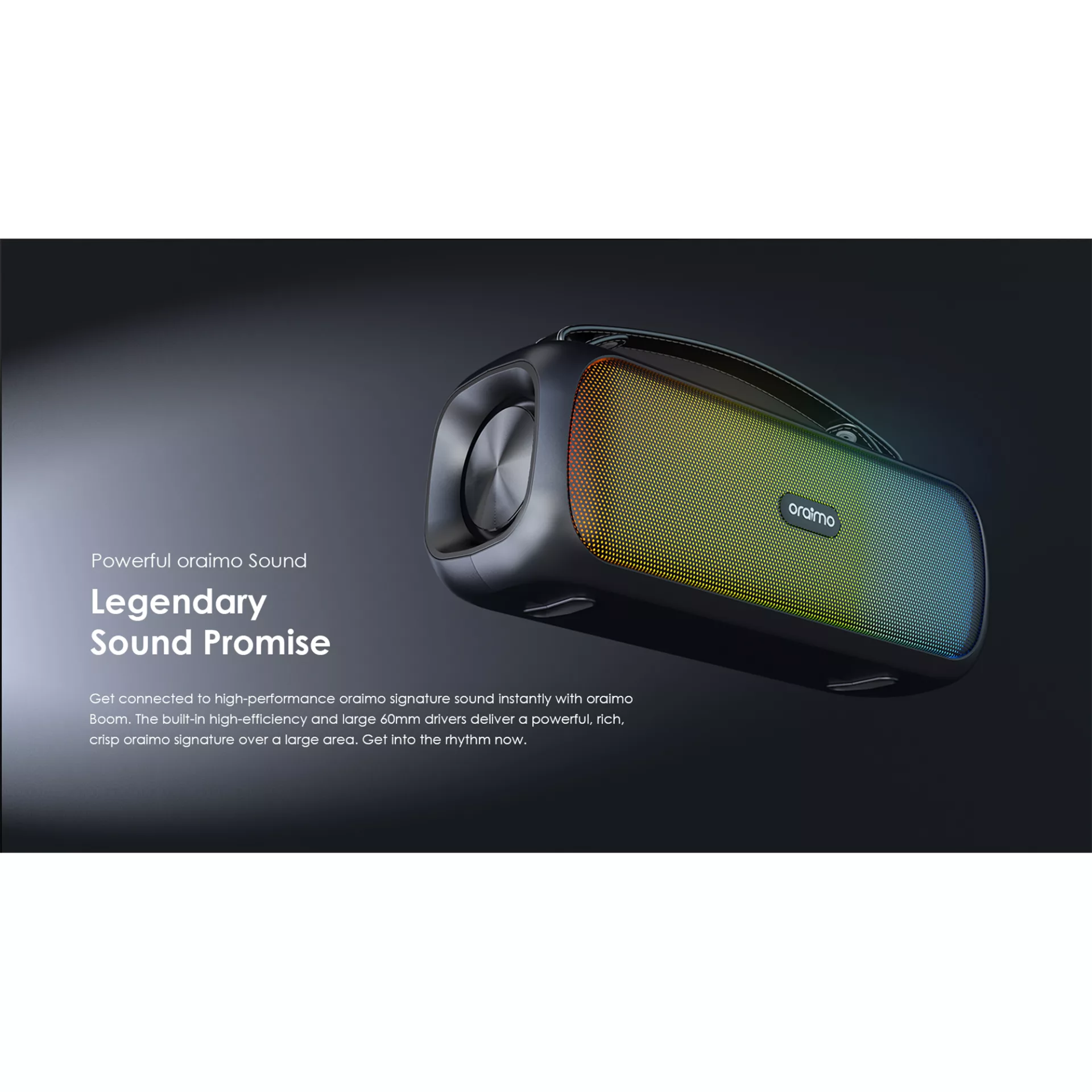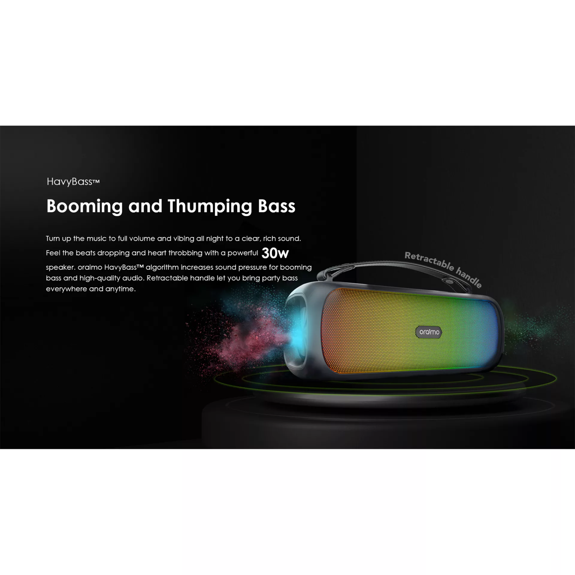 ORAIMO - PARLANTE INALÁMBRICOBOOMOBS-75D● HAVYBASS.● Emparejamiento TWS.● Potente sonido Oraimo.● Efectos de luz de fiesta dinámicos.● Bajo masivo.● Conectividad FM.El algoritmo exclusivo HavyBass ofrece frecuencias altas claras y nítidas y graves ricos y profundos, haciendo que cada sonido cobre vida más que nunca.Potencia: 30 W.Certificación: IPX5, a prueba de transpiración y salpicaduras de agua.Conectividad: BLUETOOTH 5.1.Alcance BLUETOOH: 10 m.Respuesta de Frecuencia: 85 Hz - 16 Khz.Puertos: USB x 1, MIC x 1.Dimensiones: 360 x 155 x 135 mm APROX.Batería: 3600 mAh.Tiempo de Reproducción: 6 h (luces encendidas) - 7 h (luces apagadas).Color: NEGRO.Link del Fabricante.Garantía: 1 año.Contra Defecto de Fabricación.