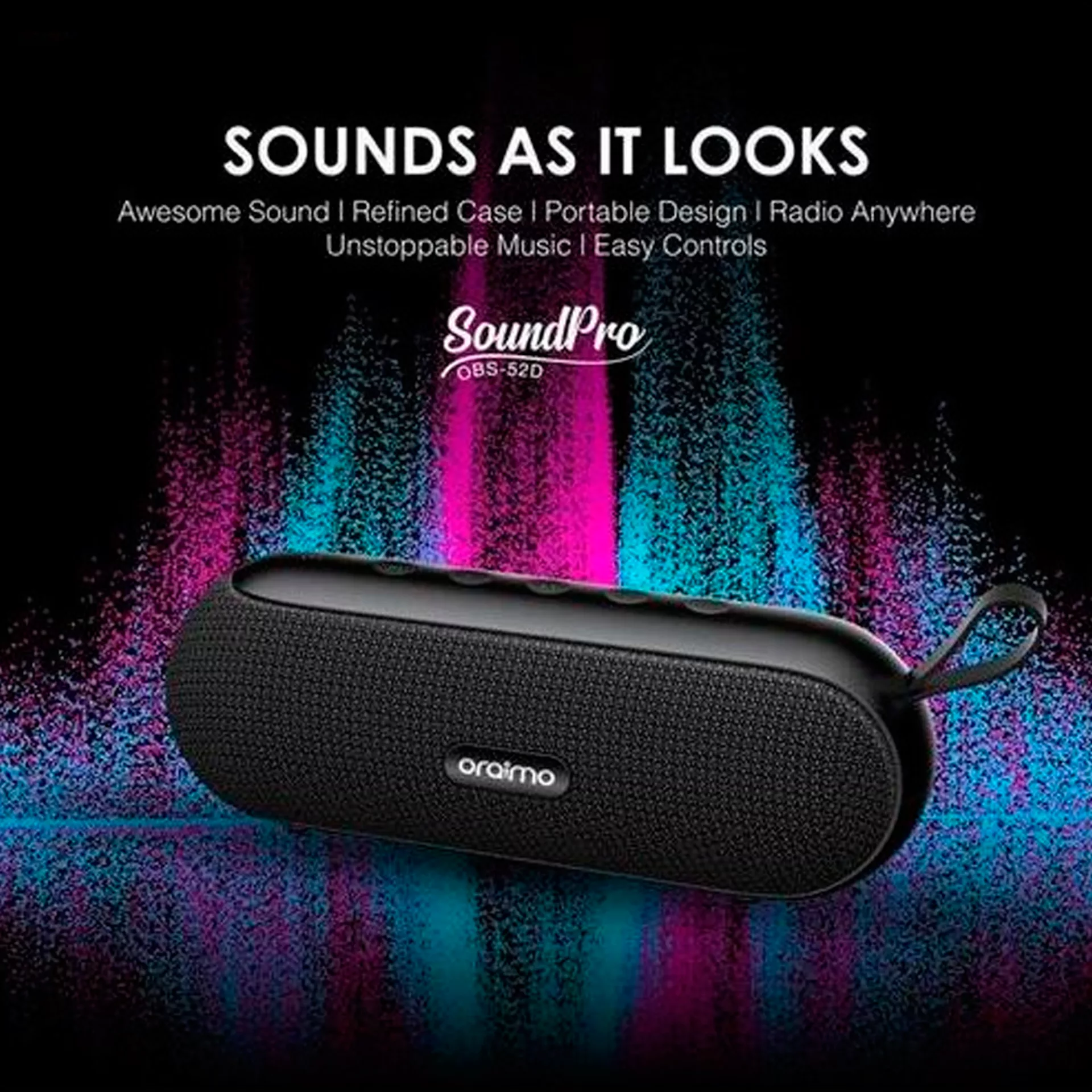 ORAIMO - PARLANTE INALÁMBRICOSOUNDPROOBS-52DPARLANTE PORTÁTIL INALÁMBRICO BLUETOOTH.Sonido impresionante, controlador doble de 5 W que ofrece un potente sonido estéreo.Disfrute de los deliciosos agudos y los graves ricos para una experiencia auditiva envolvente.Certificación: IPX4, protegido contra salpicaduras de agua.Conectividad: BLUETOOTH 5.0.Respuesta de Frecuencia: 20 Hz - 20 KHz.Salida de Altavoz: 10 W (5 W x 2).Lector de Tarjetas: TF.Puertos: USB x 1, MICRO USB x 1 (para carga), 3,5 mm x 1.Asa de transporte.Dimensiones: 213 x 80 x 80 mm APROX.Batería: 2000 mAh.Tiempo de Reproducción: 7 h APROX.Color: NEGRO.Link del Fabricante.Garantía: 1 año.Contra Defecto de Fabricación.