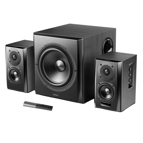 Caja de madera de calidad que minimiza la resonancia acústica y reduce la distorsión. Conexion Bluetooth 5.0, AUX y entrada optica. Potencia de salida total: 150 W RMS R/L (agudos): 15 W + 15 W, R/L (medios y graves): 25 W + 25 W, SW: 70 W Frecuencia: R/L: 160 Hz - 20 kHz / SW: 40 Hz-160 Hz Admite señales de audio digitales de 24 bits/48 kHz Medidas: Altavoz de subgraves: 312 mm x 265 mm x 289 mm Satélites: 156 mm x 127 mm x 217 mm Peso: 19.1 Kg Incluye control remoto