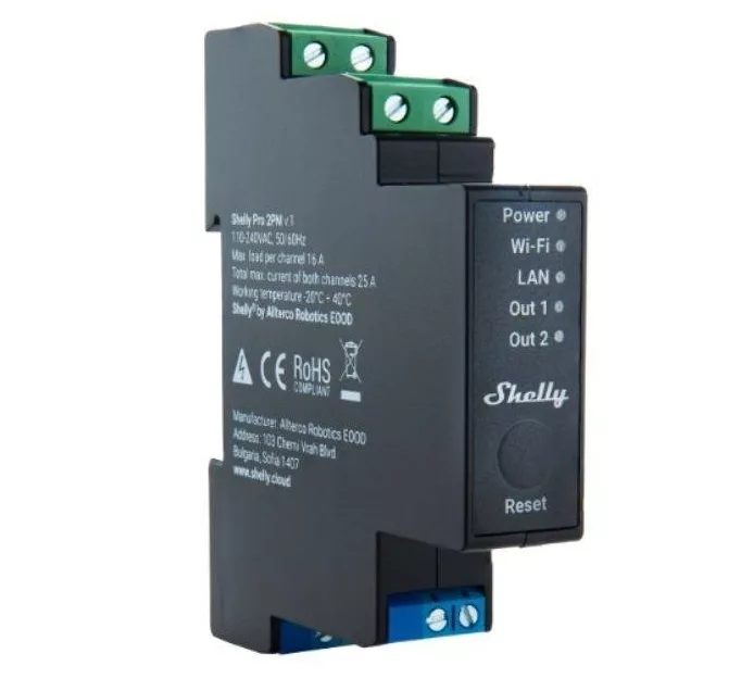 Relé DIN doble con medicion (PM) Relé DIN doble hasta 16A en cada salida Máximo total del dispositivo: 25 A Color: Negro Material: Plastico Voltaje de alimentación CA: 110 - 240 V Tensión mínima de funcionamiento CA: 90 Voltios Consumo de energía: 3W Montaje: DIN Conectividad LAN, Wi-Fi y Bluetooth Alcance de Wi-Fi: Hasta 30 metros Bluetooth 4.2 Alcance de bluetooth: Hasta 10 metros Control remoto o físico Shelly Pro 2PM puede ser accedido, controlado y monitoreado de forma remota desde cualquier lugar donde el Usuario tenga conectividad a internet, siempre que el dispositivo esté conectado a un enrutador Wi-Fi y a Internet.