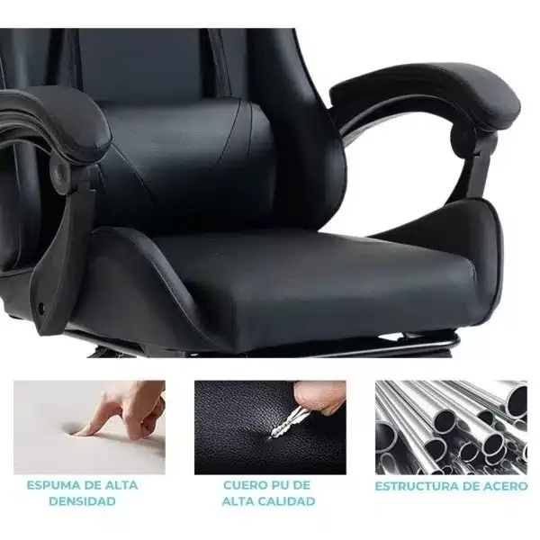 Almohadones desmontables NOTA: El producto se entrega desarmado en caja. Silla gamer ergonómica con masaje lumbar y respaldo reclinable Material del tapizado: PVC (eco cuero) Altura Regulable: Sí Apoyabrazos: Acolchonados, ajustables con articulación de alta gama Ruedas: 5 giratorias de PP resistentes, con desplazamiento suave y estable Base: Plegable de nylon resistente, que brinda estabilidad Pistón de gas: Pistón de gas clase 2, con regulación de altura y soporte seguro para uso diario Peso máximo: Soporta hasta 110 kg (recomendado 90 kg) Apoyapiés extendido retráctil: Sí Masajeador lumbar: Sí Alta durabilidad: Materiales premium, resistentes al desgaste y uso prolongado Medidas. Altura ajustable del asiento: 40 50 cm Ancho del respaldo: 52 cm Alto del respaldo: 75 cm Ancho del asiento: 58 cm Profundidad del asiento: 50 cm