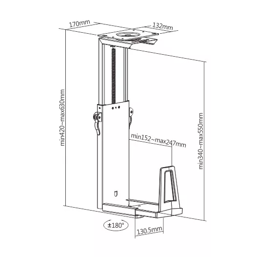 Modelo CPB-21. Soporta hasta 15Kg Materiales: Acero y plástico Color: Negro Rango de altura: 340-550 mm Rango de rpofundidad: 152-247 mm Rango de giro: +180º / -180º