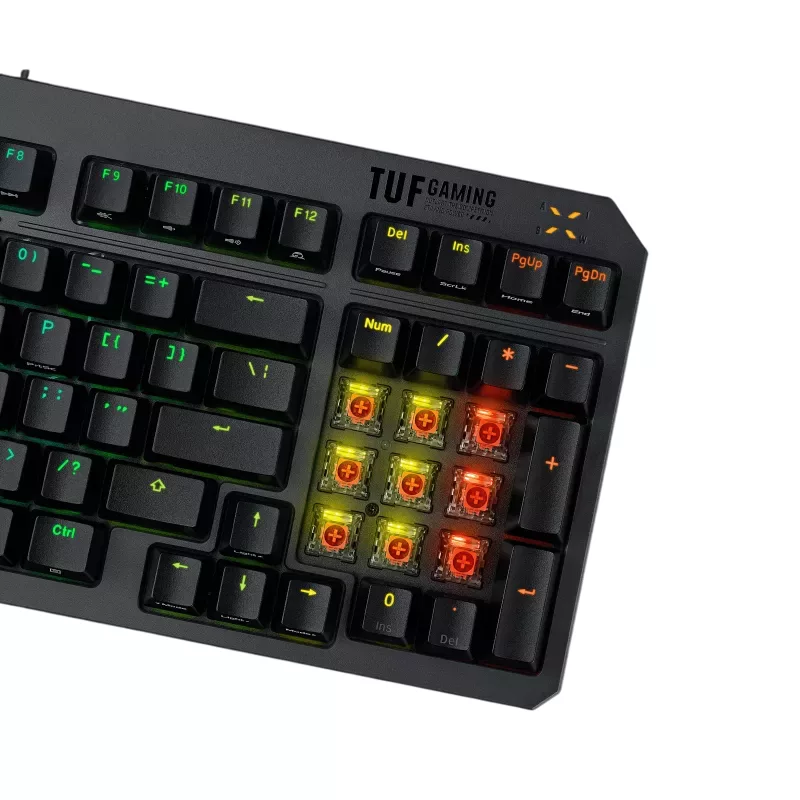 Formato: Optico-Mecanico Interruptor RGB óptico-mecánico Ilimunacion RGB por tecla Compatible con ASUS Sync Teclas: ABS de doble inyección Idioma español Espuma amortiguadora Impermeabilidad IP57 Teclas macro programables F1-F8 Largo del cable: 2 metros