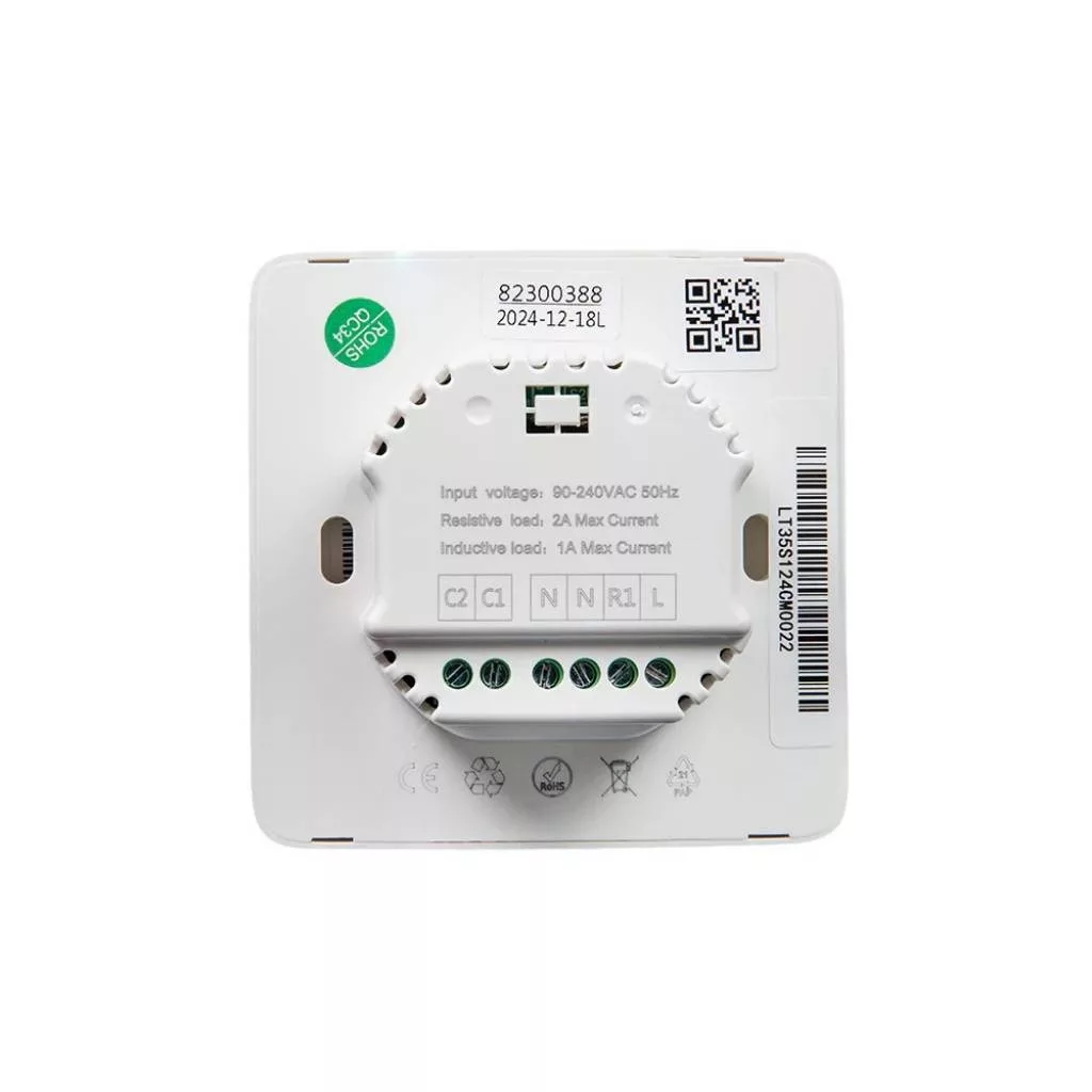 Soporta hasta 12 A e incluye medición (PM). Controlador Wi-fi para gestión precisa de sistemas de calefacción Rango de control de temperatura: 15º - 35º Precisión de la medición de temperatura: +- 0,5℃ Precisión de la medición de humedad: +- 5% Temperatura ambiente: 10 °C a 55 °C / 15 °F a 130 °F Humedad ambiental: 5-95% Fuente de alimentación: 110-240 V ±10 % 50/60 Hz CA Corriente máxima de conmutación CA carga resistiva de 2 A carga inductiva de 1 A WiFi: 802.11 b/g/n (2,4 GHz) Alcance Wi-Fi (dep