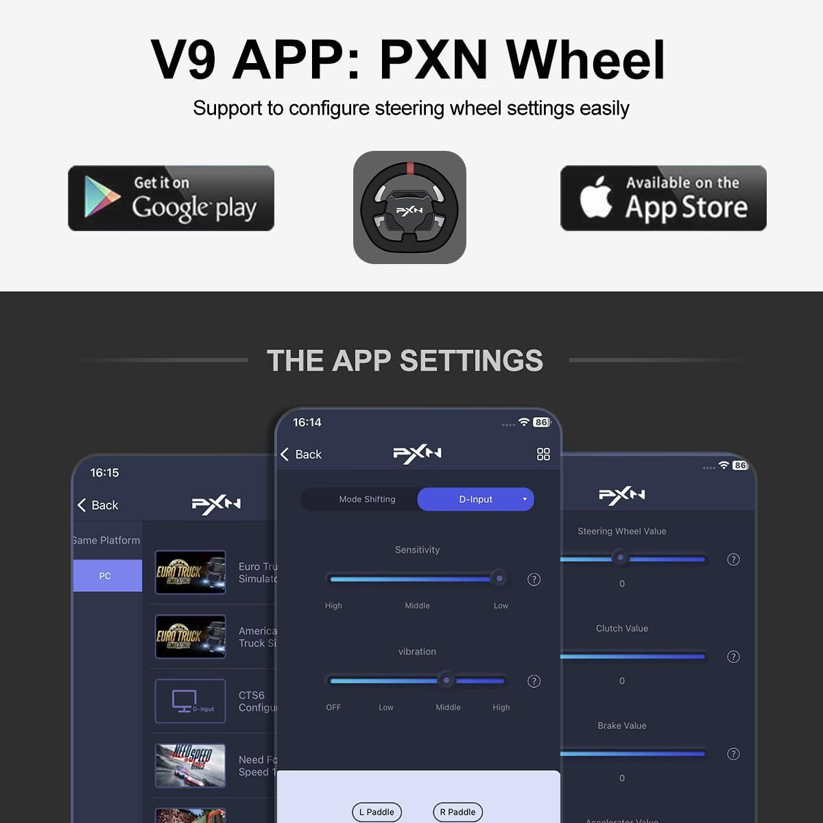 2. Las configuraciones se realizan a través de la aplicación PXN Wheel (disponible en Playstore) desde el teléfono móvil, sin necesidad de utilizar drivers.