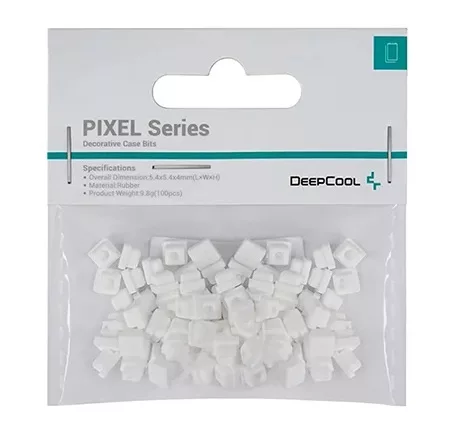 100 piezas de silicona. ¡Sé único, sé creativo, sé original y personaliza tu carcasa DeepCool con las coloridas piezas de la serie PIXEL! Cada pieza de silicona de la serie PIXEL está moldeada y cortada para que encaje perfectamente en las rejillas de numerosas carcasas DeepCool. Color: Blanco Material: Silicona Medidas: 5,4 x 5,4 x 4 mm Peso: 9.8 g (100 piezas)