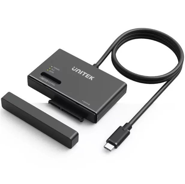 Soporta M.2, SSD, HDD El adaptador de carcasa para SSD M.2 NVMe de UNITEK es compatible con SSD M.2 PCIe NVMe, así como con SSD y discos duros SATA de 2,5/3,5. Perfecto para nuevas instalaciones de discos duros, actualizaciones, copias de seguridad de datos y más. Adaptador USB-C de 10 Gbps a disco duro SATA y SSD M.2. Dimensiones: 84,0 mm x 60,0 mm x 15,5 mm Puerto USB: 10 Gbps (USB 3.0) Alimentación: Adaptador de corriente de 12 V 2 A Longitud del cable: 30 centímetros Material: Carcasa ABS Color: Negro
