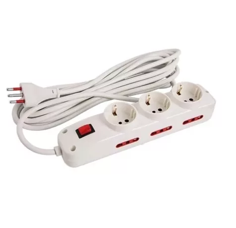 Boton ON/OFF. Material: Plastico. Color: Blanco Boton de encendido y apagado. Potencia maxima: 2500W. Amperaje 10A. 3x schuko. 6x 3 en linea. Medidas: 19 x 4 x 4.5 cm. Largo de Cable: 5m.
