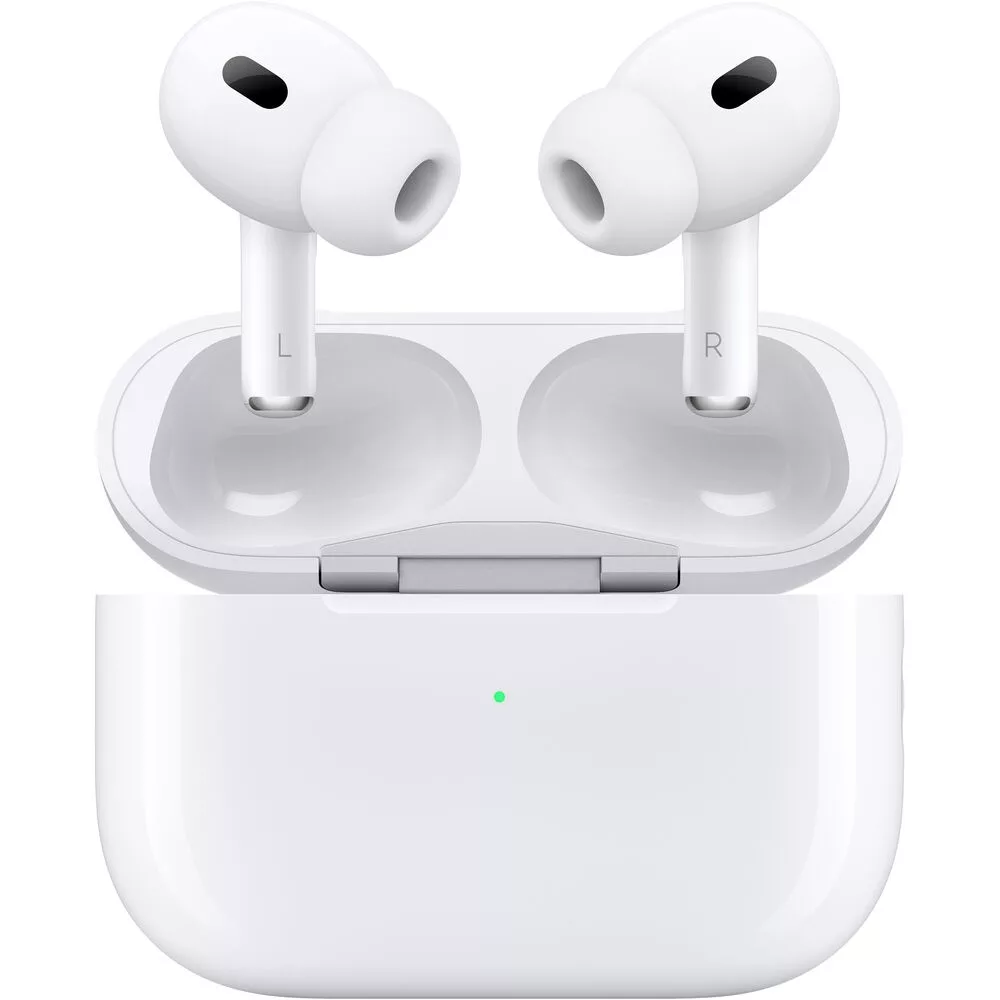 Modelo MQD83. Airpods Pro de segunda generación con estuche de carga inalámbrico Magsafe. Parlantes de baja de distorsión y amplificador customizado. Chip Apple H2. Conexión Bluetooth 5.3 Audio personalizado espacial. Cancelación de ruido activa mejorada. Modo transparente adaptativo. Hasta 6 horas de autonomía. Hasta 24 horas de uso utilizando el estuche de carga. Estuche de carga compatible con Magsafe. Sistema de rastreo "Precision Finding". Control touch de audio, llamadas y volumen. Medidas auriculares 30.9 x 21.8 x 24 mm Peso Auriculares: 5.3 g Medidas estuche: 45.2 x 60.6 x 21.7 mm Peso estuche: 45.6 g GARANTÍA OFICIAL INTERNACIONAL DE 1 AÑO* * CDR no atenderá la garantía de productos Apple. El cliente final debe llevar el dispositivo a uno de los siguientes centros de garantía oficial Apple para Uruguay: Mundo Mac: Ponce 1364 y Rivera. Tel.: 2707 6797