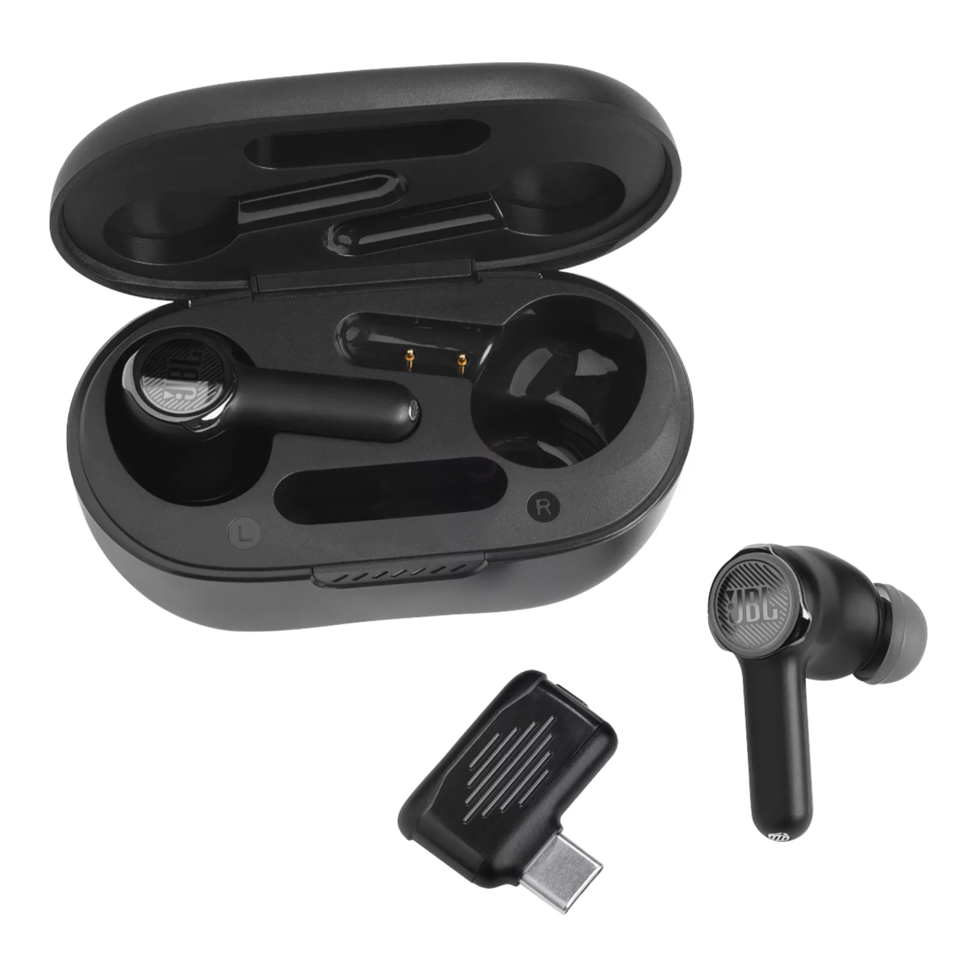 JBL - AURICULARES INALÁMBRICOSQUANTUM TWSReproduce contenido en cualquier lugar y oye todo lo que pasa con JBL Quantum TWS. La cancelación de ruido adaptable True Adaptive limita las distracciones mientras te sumerges en un sonido envolvente y preciso. Si necesitas volver al mundo real, JBL Dual Source te permite pasar del audio del juego a las llamadas entrantes de forma rápida y sencilla, mientras que Ambient Aware te mantiene al tanto de lo que te rodea. Compatible con todas las fuentes Bluetooth, la transición entre dispositivos es perfecta vayas donde vayas.JBL Quantum Surround.Sumérgete en el juego con JBL QuantumSURROUND y disfruta de un sonido envolvente y preciso. JBL QuantumSURROUND solo está disponible para PC en combinación con el software JBL QuantumENGINE. Comprueba la compatibilidad en la guía de conectividad.Conexión inalámbrica.Conexión de baja latencia de 2,4 GHz a dispositivos compatibles gracias al dongle USB-C incluido que encaja perfectamente en el estuche de carga. Los auriculares de botón JBL Quantum TWS son compatibles con todos los dispositivos compatibles con Bluetooth, como smartphones y tabletas.Conexión rápida y JBL Dual Source.Nunca pierdas una llamada mientras defiendes la galaxia. Después de conectarte con la tecnología inalámbrica sin pérdidas de 2,4 GHz a un dispositivo compatible, puedes coger fácilmente una llamada entrante a través de Bluetooth y después volver a tu conexión inalámbrica sin pérdidas de 2,4 GHz con la Conexión Multipunto JBL (Dual Source JBL).Micrófonos incluídos.No importa si estás dando indicaciones o llamando a tus amigos para jugar, tu voz siempre llegará alta y clara gracias a los 6 micróonos con tecnología beamforming que proporcionan gran calidad de llamada.Para jugar sin esfuerzo y estés donde estés.Juega siempre que quieras, de día o de noche, llueva o haga sol, con 8 horas de autonomía de la batería y 16 horas extra en la funda, además de un diseño resistente al agua IPX4 y ligero, para mayor comodidad y seguridad estés donde estés.Compatibilidad con IA múltiple.¿Necesitas ayuda en el mundo real? Toca para hablar cuando estés conectado a tu dispositivo móvil y consigue ayuda de Google y Alexa gracias a la compatibilidad con múltiples IA.Cancelación de ruido True Adaptive y Smart Ambient.No te distraigas del juego gracias a la calibración automática de la cancelación de ruido adaptable True Adaptive de JBL. O escucha tu entorno real con Ambient Aware.Certificación: IPX4 (estuche), resisten al agua y al polvo.Conectividad: BLUETOOTH 5.2.Rango de Frecuencia de Transmisión BLUETOOTH: 2,4 GHz - 2,4835 GHz.Tecnología: True Wireless.Micrófonos integrado.LLAMADAS con manos libres.Driver: 10 mm.Sensibilidad del Driver: 106 dB SPL a 1 kHz.Respuesta de Frecuencia Dinámica: 20 Hz - 20 kHz.Impedancia de Entrada: 16 ohm.Peso cada Auricular: 11 g APROX.Peso Estuche: 42.4 g APROX.Tiempo de Uso: 16h APROX.Tiempo de Reproducción de Música con ANC desactivado: 8h APROX.Tiempo de Reproducción de Música con ANC activado: 5h APROX.Tiempo de juego máximo: 16h APROX.Tiempo de Conversación: 4 h APROX.Tiempo de Carga: 2 h APROX.Color: NEGRO.Garantía: 1 año.Contra Defecto de Fabricación.