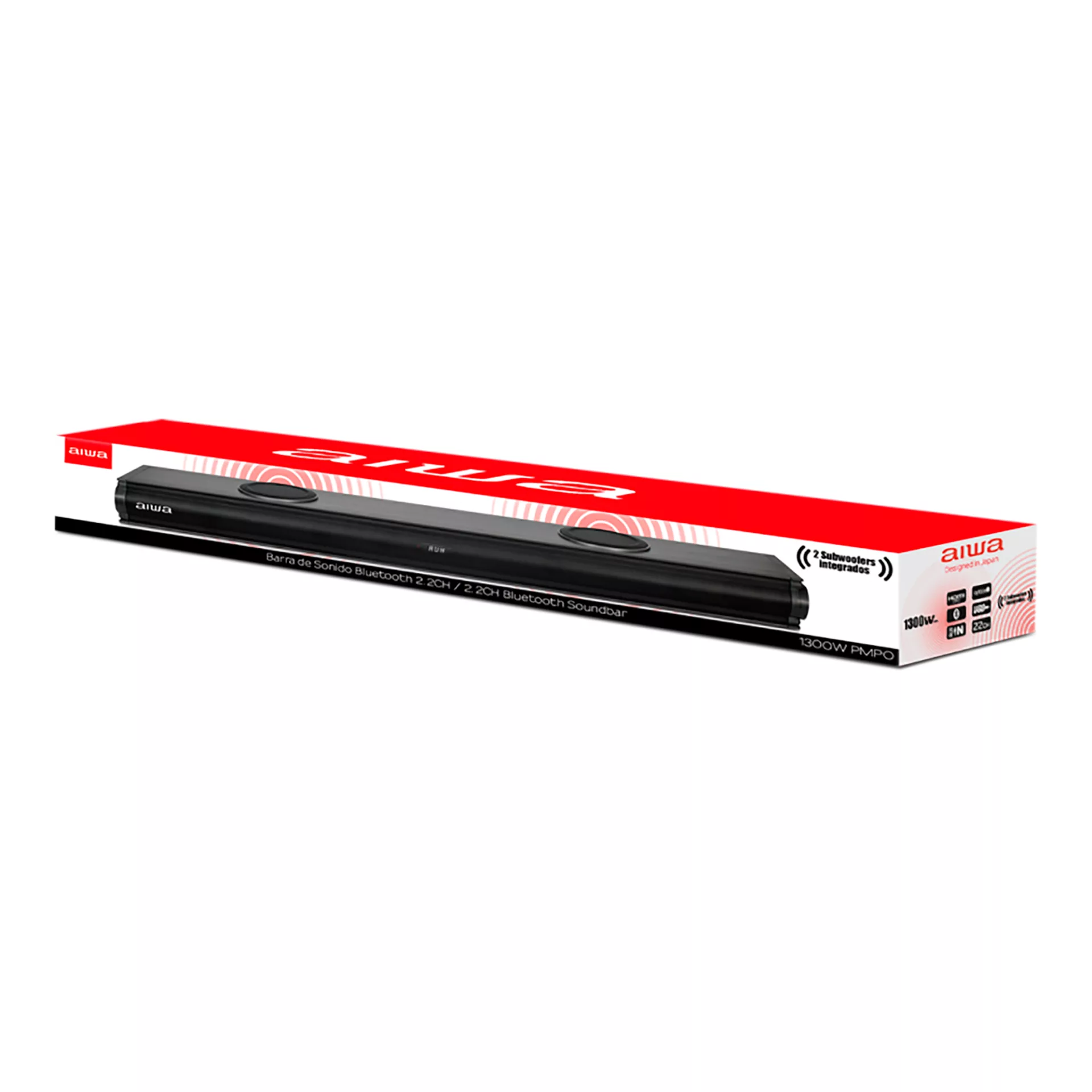 AIWA - BARRA DE SONIDO 2.2AWSBH22CANALES: 2.2 (2 subwoofer integrados a la barra).POTENCIA DE SALIDA: 130 W RMS.POTENCIA MÁXIMA: 1300 W PMPO.CONECTIVIDAD: BLUETOOTH 5.0.Alcance BLUETOOTH: 10 m APROX.Pantalla LED con 3 preajustes de ecualización.Relación Señal / Ruido: 80 dB APROX.Reproducciones de Puerto USB: MP3, WAV.Puertos: HDMI (ARC) x 1, USB x 1, ÓPTICO x 1, COAXIAL x 1, AUX IN x 1, AC IN x 1.Dimensiones: 980 x 165 x 75 mm.Fuente de Alimentación: 100 - 230 V / 50/60 Hz.Color: NEGRO.INCLUYE: CONTROL REMOTO, CABLE DE AUX IN, CABLE DE ALIMENTACIÓN.Garantía: 1 año.Contra Defecto de Fabricación.