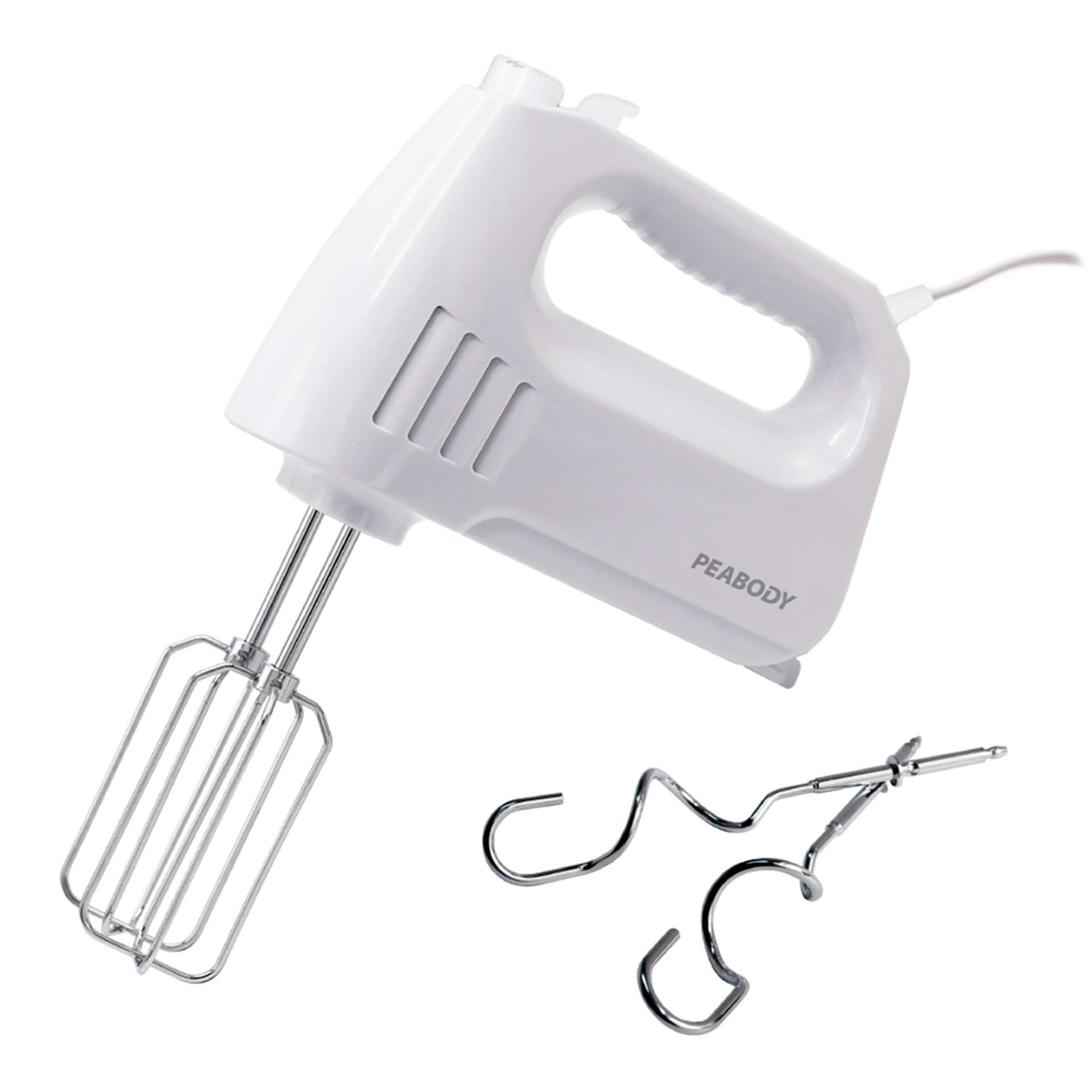 PEABODY - BATIDORA DE MANOPE-HM550BPotencia: 300 W.4 velocidades + Turbo.Sistema de apoyo sobre el bowl.Color: BLANCO.INCLUYE: BATIDORES Y AMASADORES.Garantía: 1 año.Contra Defecto de Fabricación.