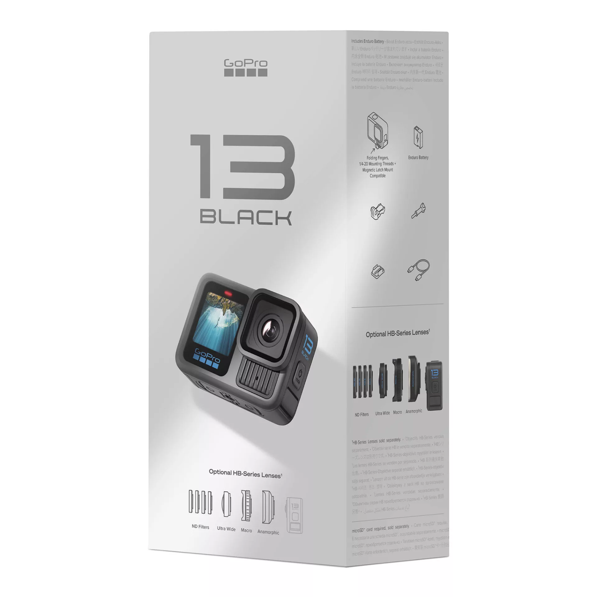 GOPRO - CÁMARA EXTREMAHERO 13 BLACKCHDHX-131-RWCÁMARA EXTREMA ROBUSTA Y SUMERGIBLE: 10 METROS.Pantalla Trasera: 2,27'' TÁCTIL.Pantalla Delantera: 1,4'' COLOR.RESOLUCIÓN DE FOTO: 27,13 MP (5568 x 4872).RESOLUCIÓN DE VIDEO: 5,3K.Conectividad: WIFI 6, BLUETOOTH 5.3.GPS.Lector de Tarjetas: MICRO SD.Puertos: USB C x 1.Puerto HDMI: Módulo multimedia (H9B/H10B/H11B/H12B).Descarga automática al smartphone.Subida automática a la nube con una suscripción a GoPro.Montaje: Integrado con los adaptadores plegables. Soporte ¼-20.Peso: 159 g APROX (cámara con adaptador de montaje y batería).Dimensiones: 71,8 x 50,8 x 33,6 mm APROX.Batería: ENDURO 1900 mAh.Color: NEGRO.Foto.Modos foto: Estándar, Ráfaga de fotos, Foto nocturna.Capturas de fotogramas de videos: 24,69 MP de video 5,3K (8:7), 21,16 MP de video 5,3K (4:3), 15,87 MP de video 5,3K (16:9).Salida de foto: SuperFoto, HDR, Estándar, RAW.Formatos de foto: .jpg, .gpr (RAW).Captura de fotos RAW: 27,13 MP (5568 x 4872).Lentes digitales (foto individual): Gran Angular, Lineal.Temporizador de foto: 3 s, 10 s.Intervalos de fotos: 0.5 s, 1 s, 2 s, 3 s, 5 s, 10 s, 30 s, 60 s, 120 s.Velocidades de ráfaga de fotos (fotograma / segundo): Auto, 60/10, 60/6, 30/6, 30/3, 10/3, 30/1, 10/1, 5/1, 3/1.Velocidad del obturador de foto nocturna: Auto, 2, 5, 10, 15, 20, 30 s.Secuencia.Video TimeWarp: TimeWarp 3.0 (hasta 5,3K).Velocidades de video TimeWarp: Auto, 2x, 5x, 10x, 15x, 30x.Estelas de estrellas: Si.Pinturas de luz: Si.Estelas de luces de vehículos: Si.Resolución de video secuencial: Hasta 5,3K.Intervalos de secuencia (foto y video): 0,5, 1, 2, 3, 5, 10, 30, 60 s; 2, 5, 30, 60 min.Resolución de video de secuencia nocturna: Hasta 5,3K.Intervalos de video de secuencia nocturna (foto y video): Auto, 4, 5, 10, 15, 20, 30, 60 s; 2, 5, 30, 60 min.Video.Resoluciones y tasas de fotogramas de los videos: 5,3K (8:7) 30/25/24 fps, 5,3K (16:9) 60/50/30/25/24 fps, 4K (8:7) 60/50/30/25 fps, 4K (9:16) 60/50/30/25, 4K (16:9) 120/100/60/50/30/25/24 fps, 2,7K (4:3) a 120/100 fps, 2,7K (16:9) 240/200 fps, 1080 (9:16) 60/50/30/25, 1080p (16:9) 240/200/120/100/60/50/30/25/24 fps.Estabilización de video: HyperSmooth 6.0.Relación de aspecto: 16:9, 9:16, 4:3, 8:7.Video HDR: 5,3K (16:9) 30/25/24 fps, 4K (8:7) 30/25/24 fps, 4K (16:9) 60/50/30/25/24 fps.Lentes digitales: HyperView, SuperView, Gran Angular, Lineal, Lineal con Alineación con el horizonte / Bloqueo del horizonte.Bloqueo del horizonte / Alineación con el horizonte 360°: Bloqueo: Lente Lineal con Bloqueo del horizonte; Alineación: En la cámara (23-27) para 5,3K60, 4K120, 2,7K240, 1080p240; Se puede aplicar en posproducción usando la aplicación Quik.Estándar de compresión de video: H.265 (HEVC).Profundidad de bits de video en color: 8 bits, 10 bits (4K y superior).Máxima tasa de bits de video: 120 Mbps.Zoom video: Hasta 2x.Cámara lenta: 8x - 2,7K y 1080p, 4x - 4K, 2x - 5,3K.Ráfaga Cámara lenta: 13x (400 fps) - 720p durante 15 s, 12x (360 fps) - 900p durante 15 s, 4x - 5,3K durante 5 s.Grabación en bucle: Si.HindSight: Si.Captura programada: Si.Transmisión en directo: 1080p30 con HyperSmooth + grabación 1080p60.Modo webcam: Hasta 1080p30.Sincronización del código de tiempo: Si.Control de exposición: Si.Valor de exposición (comp VE): 2+/-.Audio.Micrófonos: 3.Audio estéreo: Si.Reducción del ruido avanzada: Procesamiento de 3 micrófonos.Captura de audio RAW: Formato WAV.Entrada de micrófono de audio de 3,5 mm: Módulo multimedia (H9B/H10B/H11B); Adaptador de micrófono Pro de 3,5 mm.Audio inalámbrico: Compatible con Airpods y otros auriculares Bluetooth.Calidad de imagen / Especificaciones de hardware.Procesador del Sistema: GP2.Sensor de Imagen: CMOS de 1/1,9'', 27,6 MP de píxeles activos (5599 x 4927).Apertura de la Lente: F2,5.Longitud focal equivalente a 35 mm: 12 mm (mínimo) / 39 mm (máximo).Interfaz de Usuario.Protune: Si.Ajustes predeterminados / Ajustes predeterminados personalizados: Si.Control por voz: 14 comandos, 11 idiomas con 6 acentos.Experiencia de usuario tras la captura.Metadatos avanzados: Si.Compatible con el ecosistema: Aplicación Quik GoPro Labs Open GoPro.Garantía: 1 año.Contra Defecto de Fabricación.