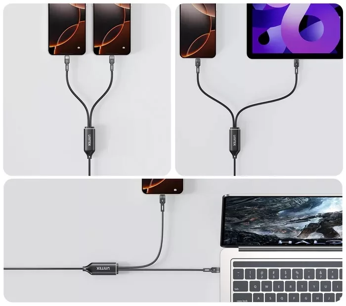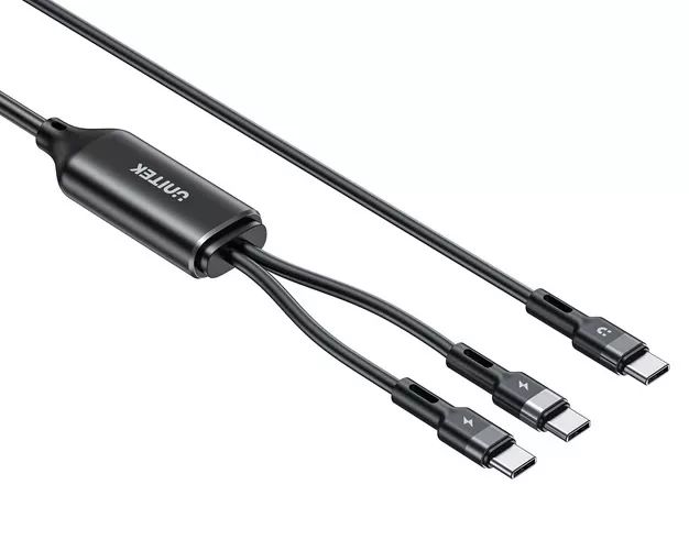Carga multiple Disfruta de la comodidad de cargar simultáneamente en cualquier momento y lugar con el cable USB-C 2 en 1 UNITEK PD100W. Alimenta fácilmente dos dispositivos tipo C simultáneamente, perfecto para la escuela, el hogar, el trabajo o viajes. Longitud del cable: 1,8 M (cable de alimentación 1,2 M + 0,6 M) Enlace ascendente: USB-C Enlace descendente: puerto único PD/PD2, potencia de carga máxima 100 W. Carga de puerto dual PD1 + PD2, salida máxima de hasta 65 W y 30 W. Material: silicona Color: Negro