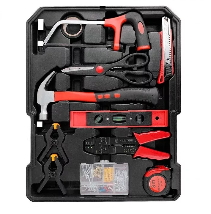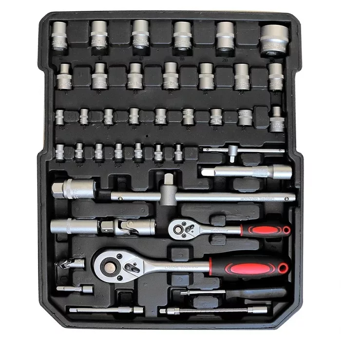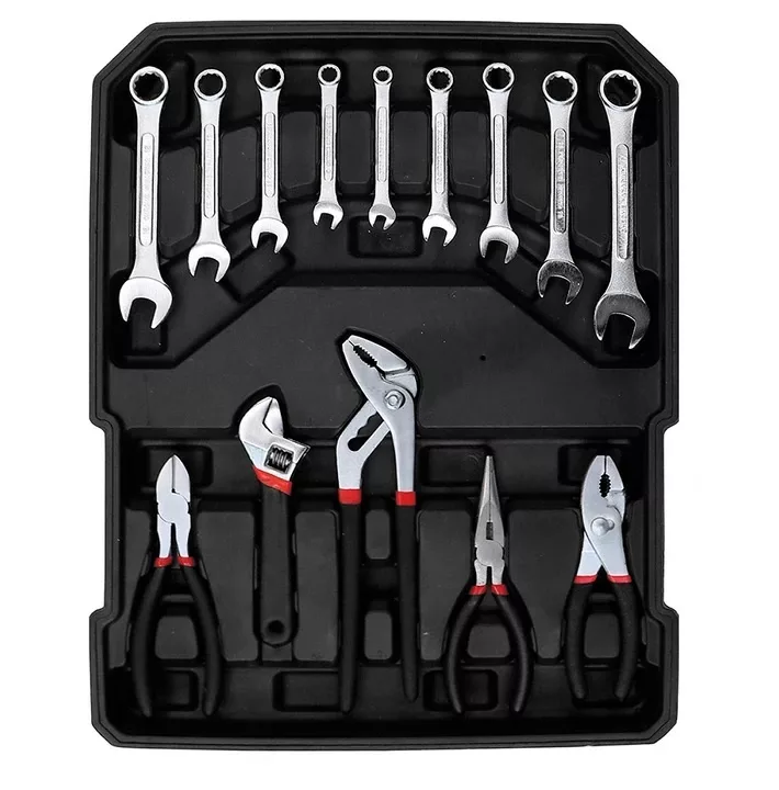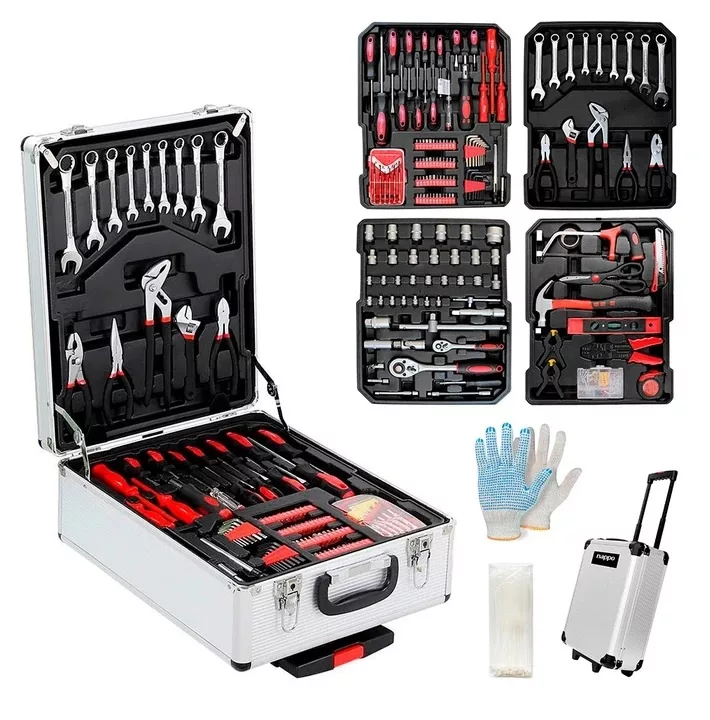 Valija de elegante diseño en aluminio con mango telescópico, asa y ruedas Mantenga sus herramientas ordenadas y en un solo lugar. Ideal para el hogar, trabajo, bricolaje o para dejar en el garaje. Incluye llave de cierre, de modo que la seguridad esté garantizada. Accesorios 9 llaves combinadas de 6 - 17mm. Pinza pico de loro 150mm. Alicate de punta larga de 150mm. Alicate extensible (pico de loro) de 230mm. Llave inglesa de 150mm. Alicate diagonal de 150mm. Adaptador de criquet. 2 llaves de criquet. 5 extensores rectos. 2 llaves manuales para dados. 2 extensores articulados. Destornillador de dados. 29 dados. 14 destornilladores. Mango de destornillador. Buscapolo. 6 destornilladores de precisión. 48 puntas de destornillador. 16 llaves allen de 1,5 a 6 mm. Medidor de presión de neumáticos. 2 pinzas de 90mm. Cinta métrica. Pinza pela-cable. Ni