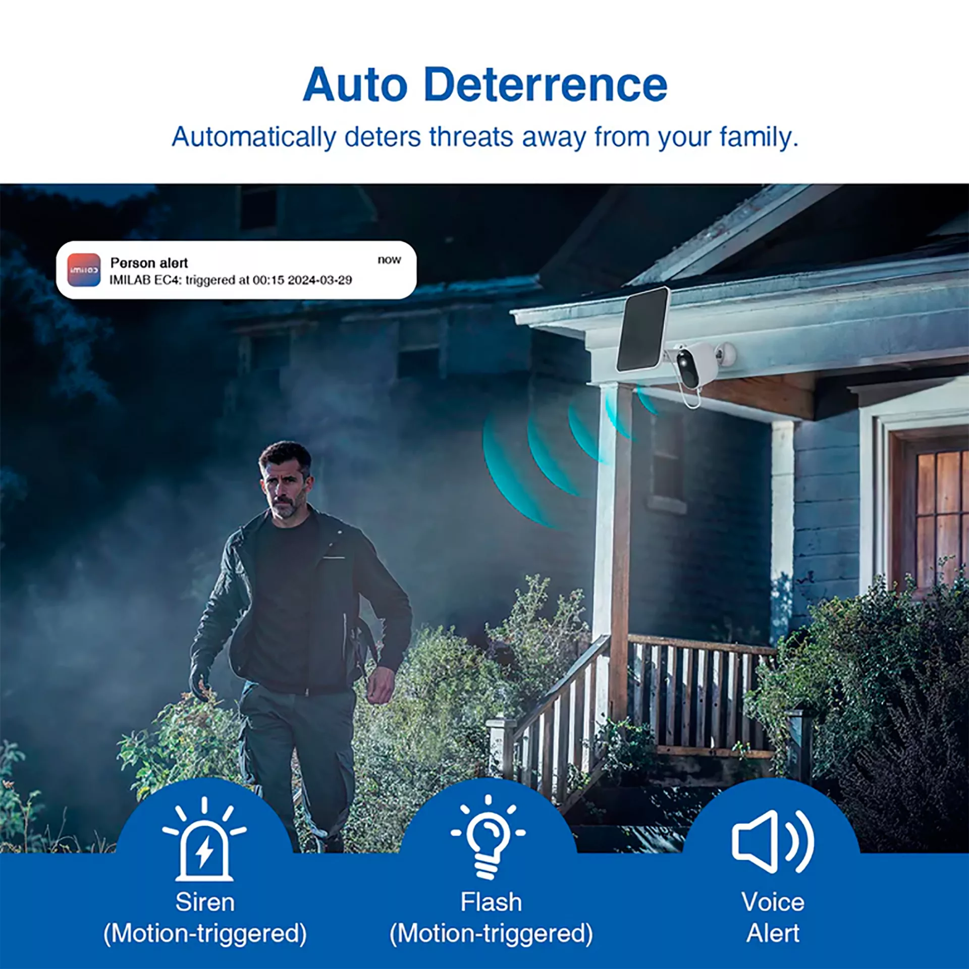XIAOMI - CÁMARA SPOTLIGHT INALÁMBRICA DE VIGILANCIA DÍA Y NOCHEIMILAB EC4La cámara IMILAB EC4 ofrece una resolución de 2,5K y chat en vivo para una conexión sin esfuerzo con los visitantes en todo momento. Con detección avanzada de personas, disuade eficazmente la actividad sospechosa. Al ser inalámbrica, es perfecta para áreas sin acceso a la electricidad. Además, ofrece la opción de alimentación mediante panel solar.Grado de Impermeabilidad: IP66.Resolución: 2,5K.Audio Bidireccional.Conectividad: WIFI 802,11 b/g/n 2,4 GHz.Luces: 2 luces LEDs + 2 luces infrarrojas.Lentes: 1.Zonas de Movimiento Personalizadas: 1.Detección: Personas.Vista en vivo.Visión nocturna en color.Visión infrarroja.Sirena: Activada por movimiento.Flash: Activado por movimiento.Alerta de Voz Personalizada: OTA.Compatibilidad Asistentes de Voz: Amazon Alexa, Google Assistant.Almacenamiento en la nube (requiere pago).Lector de Tarjetas: MICRO SD.Puerto para panel solar.Peso: 320 g APROX.Dimensiones: 86,8 x 82 x 50 mm APROX.Batería: 5200 mAh recargable.Tiempo de Uso: 3 meses.App: IMILAB Home.Color: BLANCO.* La cámara IMILAB EC4 necesita Hub para funcionar.Garantía: 1 año.Contra Defecto de Fabricación.