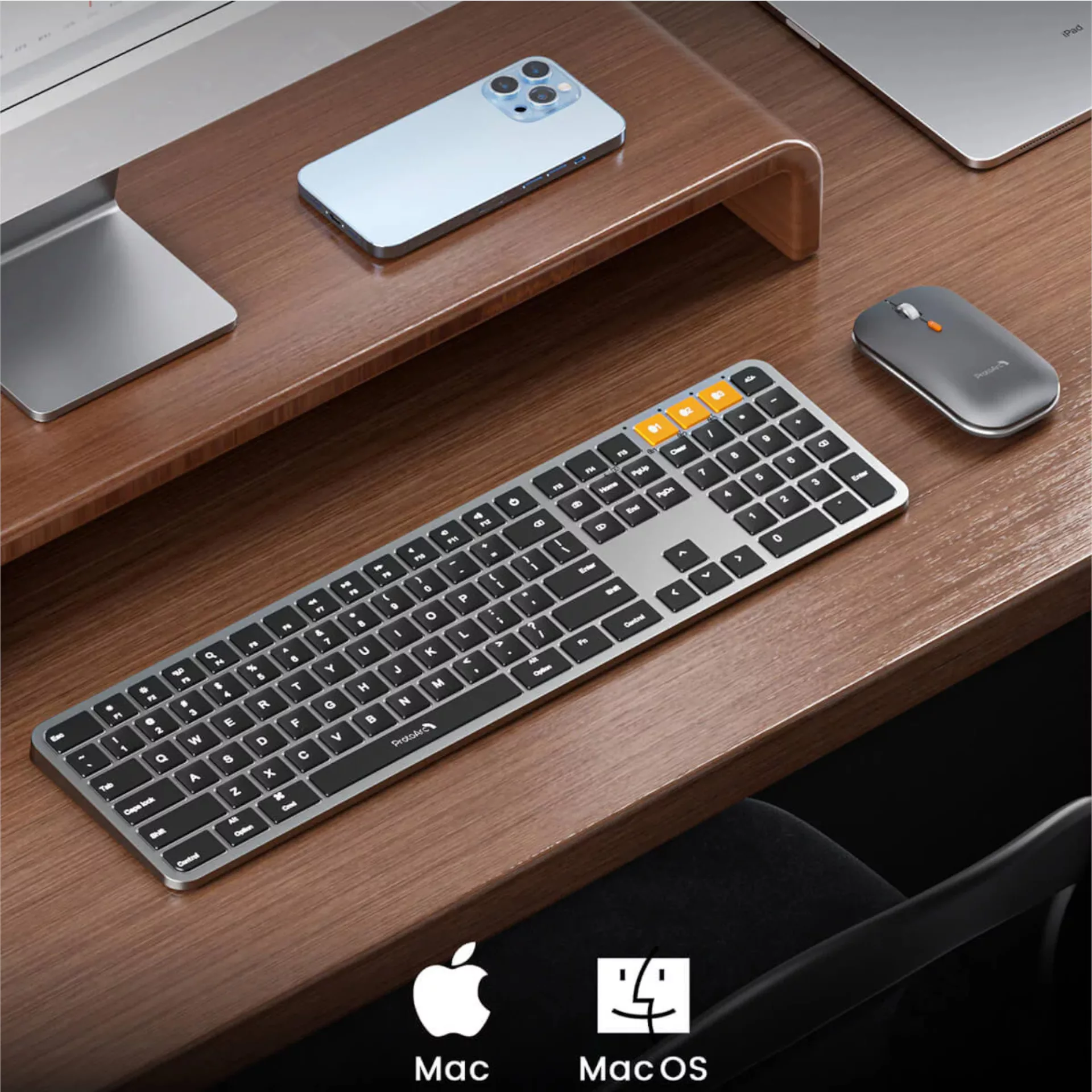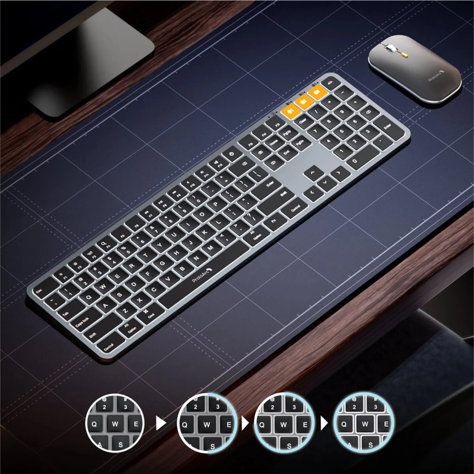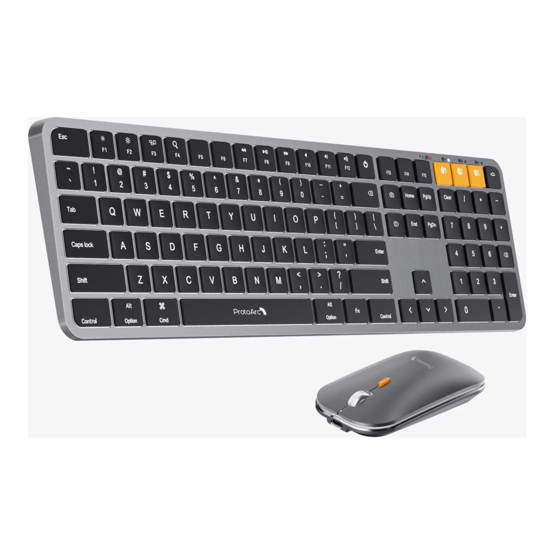 PROTOARC - COMBO MOUSE Y TECLADO BLUETOOTHKM100-ALuz de fondo personalizable.Equipado con retroiluminación LED blanca brillante, cuenta con tres niveles de brillo ajustables (bajo, medio, alto) para satisfacer todas las necesidades, lo que te permitirá escribir cómodamente en entornos con poca luz sin cansar la vista.Conexión para tres dispositivos.Permite conectar hasta tres dispositivos a la vez mediante Bluetooth. Además cuenta con una amplia compatibilidad de dispositivos, ya que es compatible con Windows, Mac, iOS y Android.Recargable y con DPI ajustable.Tanto el mouse como el teclado cuentan con baterías de polímero de litio, el mouse tiene una capacidad de 300 mAh y el teclado tiene una capacidad de 1200 mAh. Además, el ratón tiene tres niveles de DPI ajustables lo que permite un control más preciso.CONECTIVIDAD: BLUETOOTH.Alcance INALÁMBRICO: 8 m APROX.Compatibilidad: WINDOWS / MAC / IOS / ANDROID.MOUSE.CLICK SILENCIOSO.Sensor: Óptico.DPI: 1000 / 1600 / 2400.Botones: 3.Dimensiones: 108 x 59 x 23,5 mm APROX.Batería: LI-PO 300 mAh.Color: GRIS.TECLADO INGLÉS. NÚMERICO.DISEÑO CON RETROILUMINACIÓN BLANCA (3 NIVELES DE BRILLO).Dimensiones: 426,1 x 121,4 x 14,1 mm APROX.Batería: LI-PO 1200 mAh.Color: GRIS / NEGRO.Link del Fabricante.Garantía: 1 Año.Contra Defecto de Fabricación.