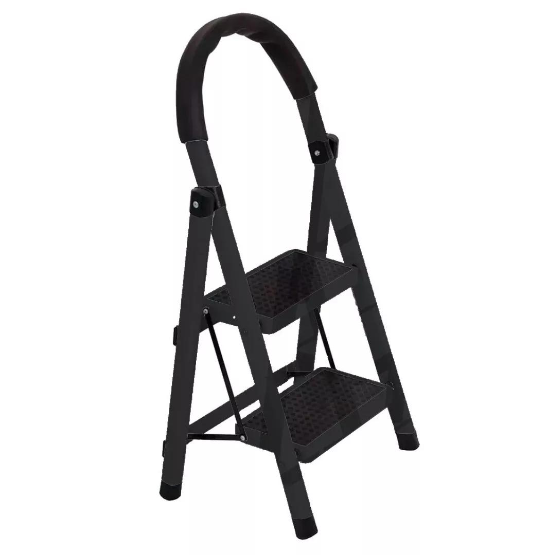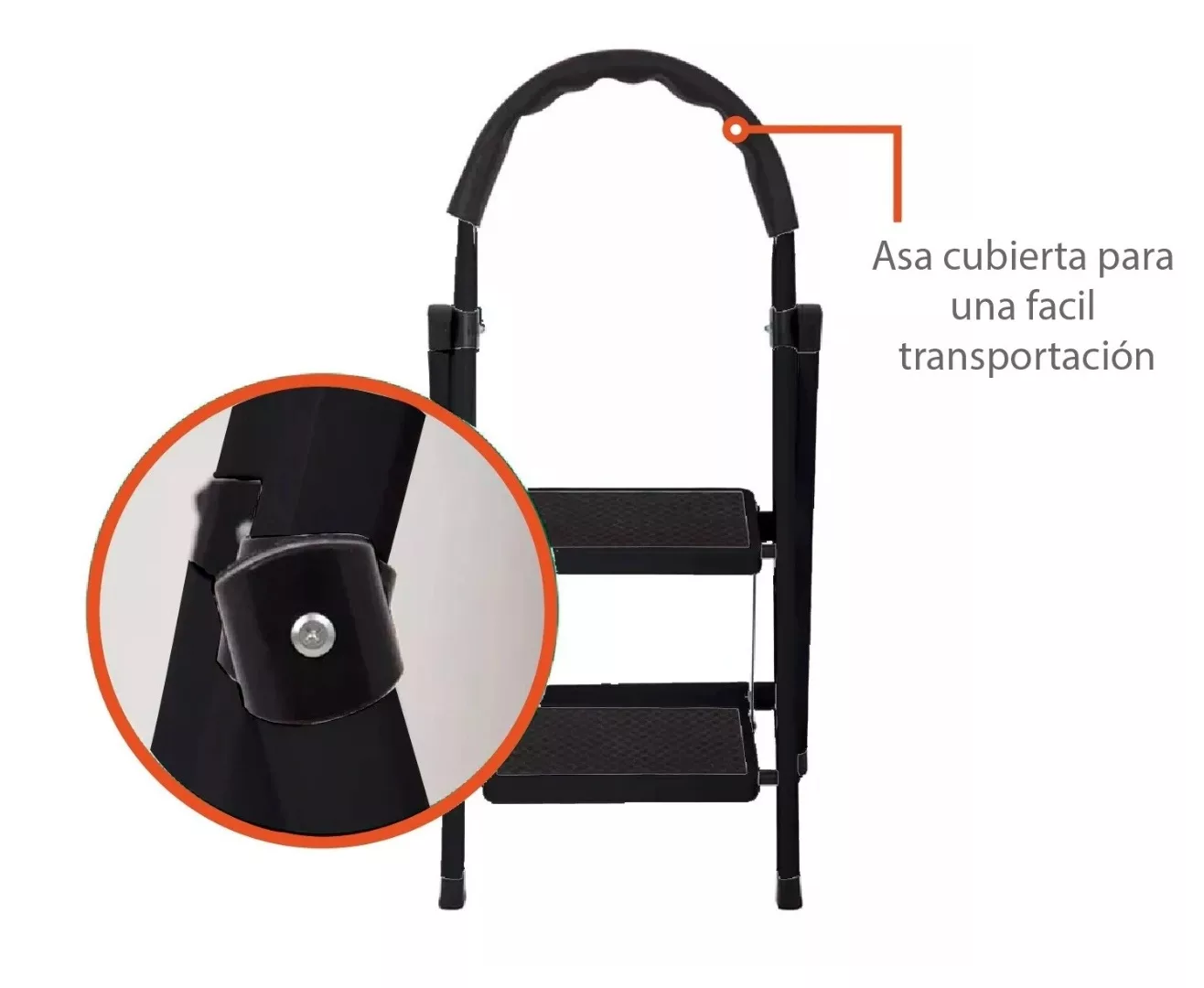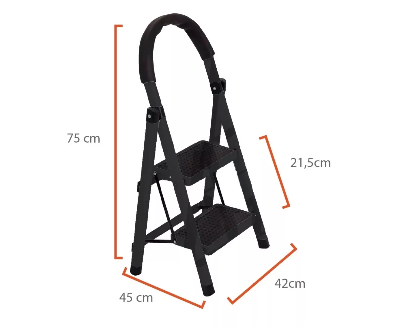 Construida en metal y plastico. Color Negro Estilo: Tijera 2 escalones Base antideslizante Asa superior recubierta Altura de escalon: 21.5 cm Soporta hasta 120 kg. Material de estructura: acero Material de los escalones: plástico