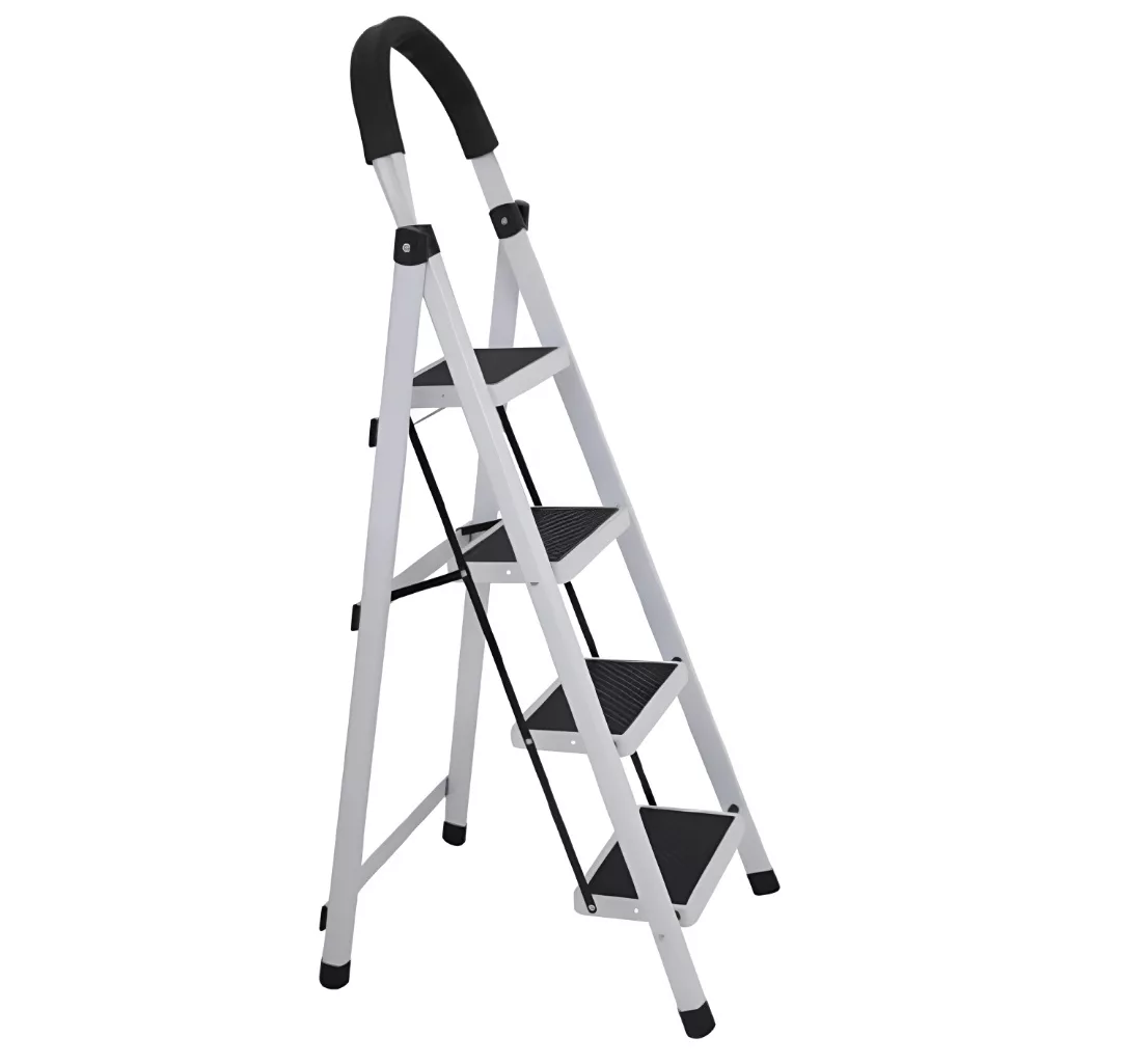 Construida en metal y plastico. Color Negro y blanco Estilo: Tijera 4 escalones Base antideslizante Asa superior recubierta Altura de escalon: 21.5 cm Soporta hasta 120 kg. Material de estructura: acero Material de los escalones: plástico
