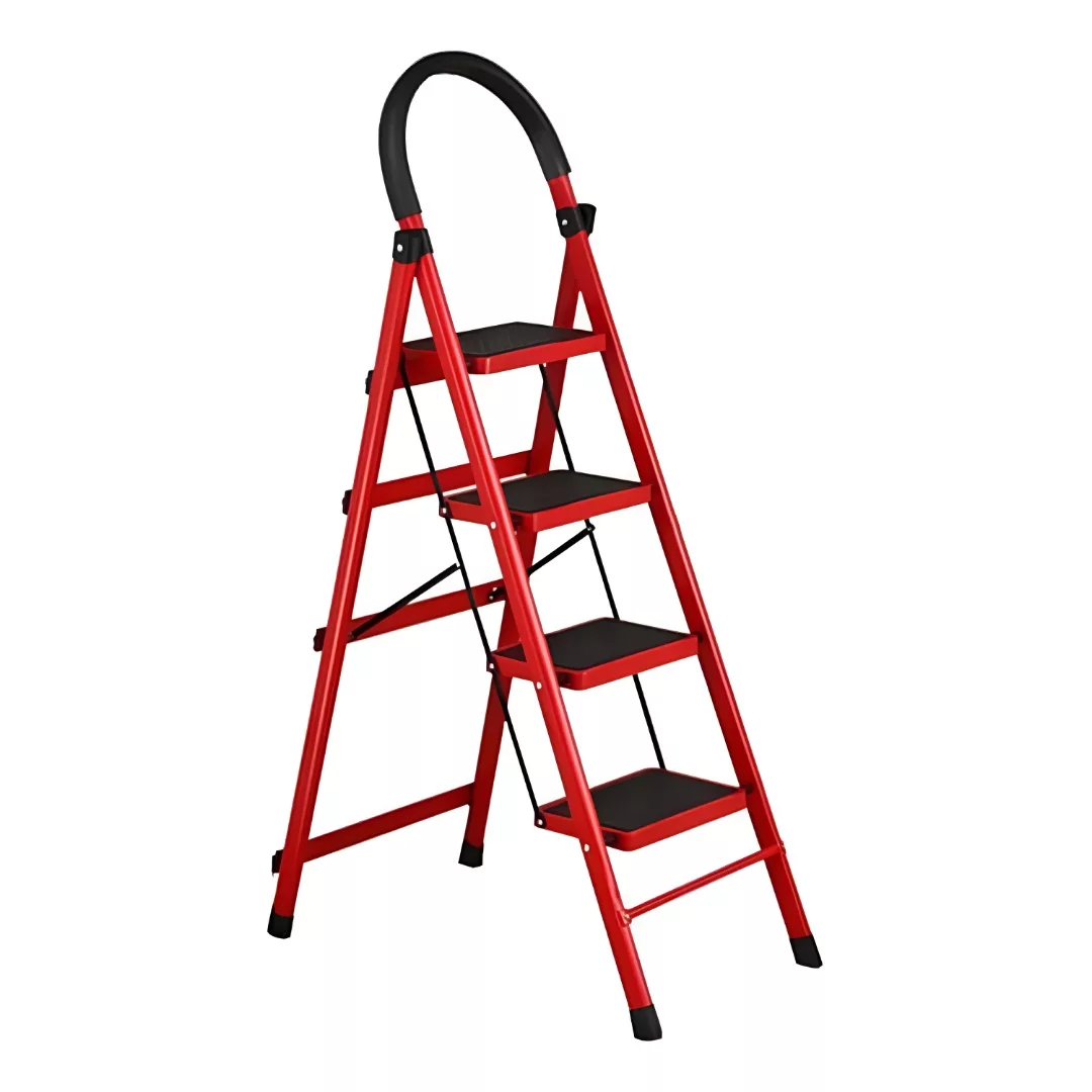 Construida en metal y plastico Color Negro y roja Estilo: Tijera 4 escalones Base antideslizante Asa superior recubierta Altura de escalon: 21.5 cm Soporta hasta 120 kg. Material de estructura: acero Material de los escalones: plástico