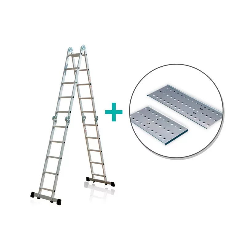 Contruida en aluminio. Longitud de extencion: 580 cm 20 escalones Soporta hasta 150KG 10 posiciones Patas transversales Tacos de goma antideslizantes Sistema de trabas automatico Crike reforzado Trabas reforzadas Plataformas de acero para andamio completo