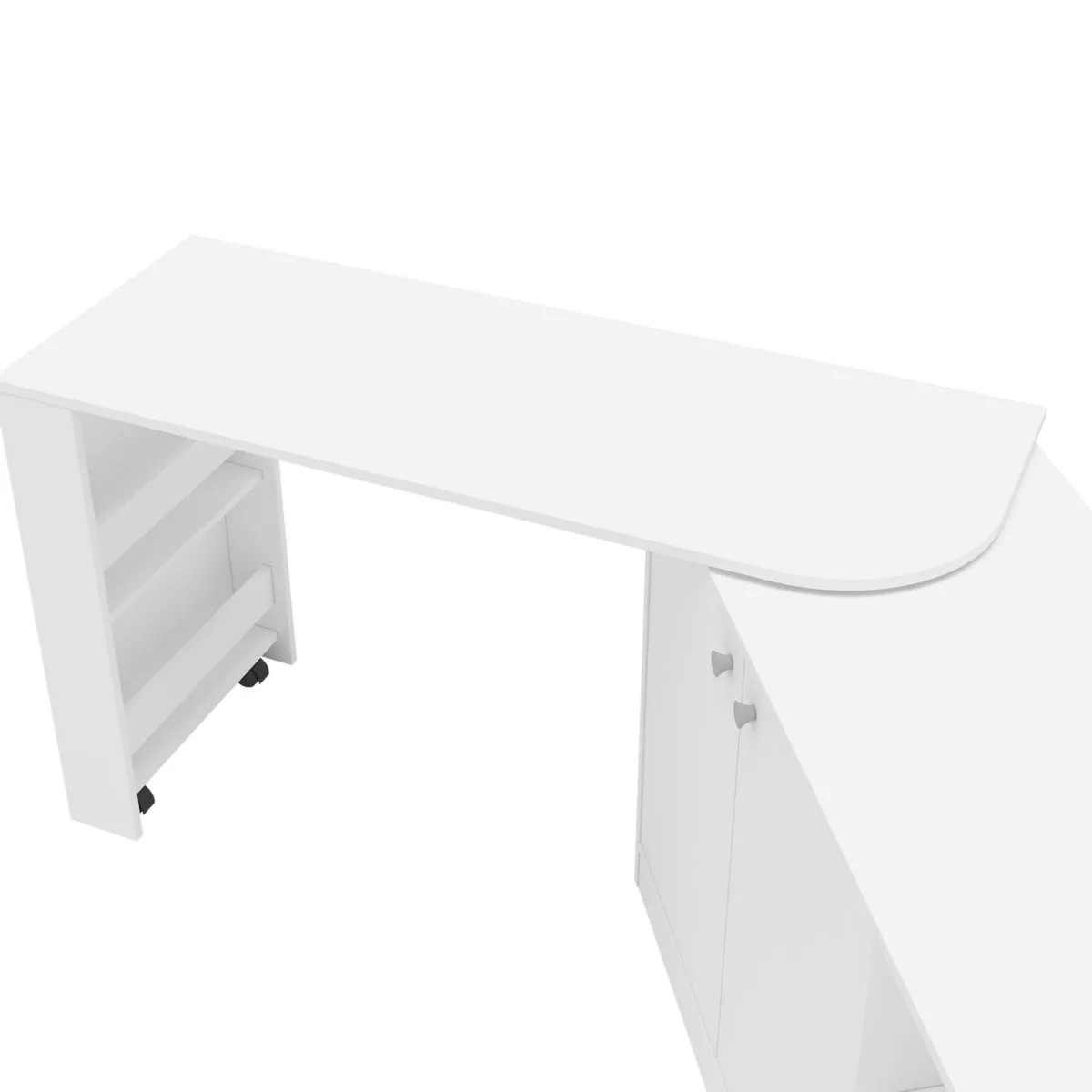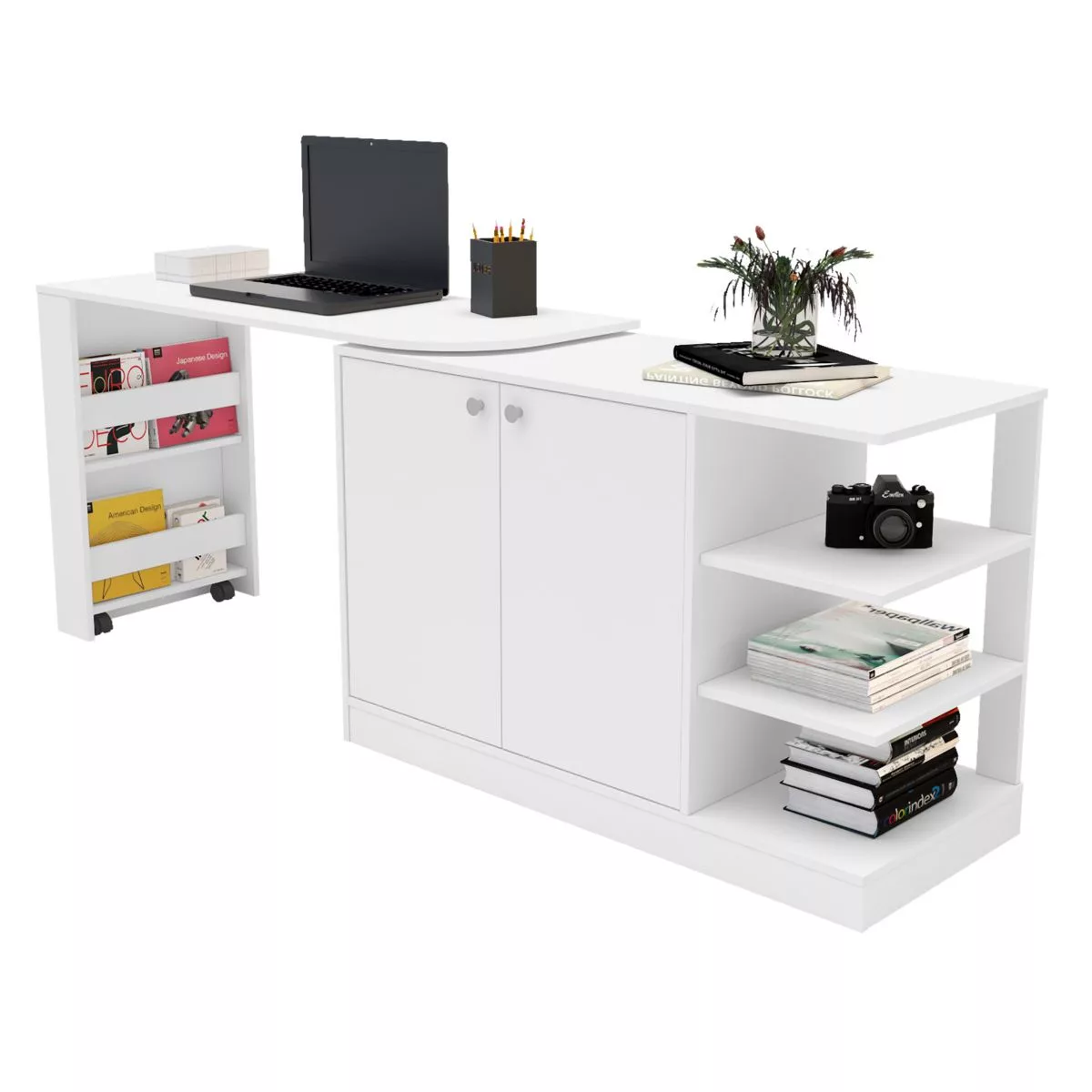 Mesa de trabajo extensible, armario de 2 puertas con estante interior, 3 estantes a la vista y 3 estantes libreros.