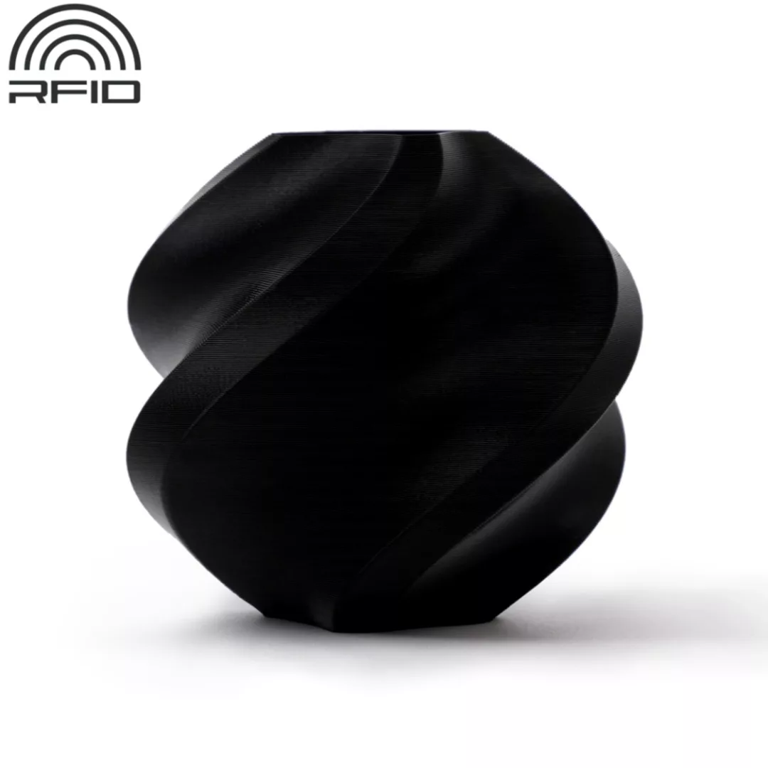 Carrete Bambu Lab con RFID Color negro - Black (10101) Facil de imprimir y amigable con principiantes. Terminación de superficie suave. Impresión inteligente con RFID* Biodegradable. Diámetro: 1.75mm +/- 0.03mm Peso neto: 1kg *Compatible con sistemas AMS Bambu Lab