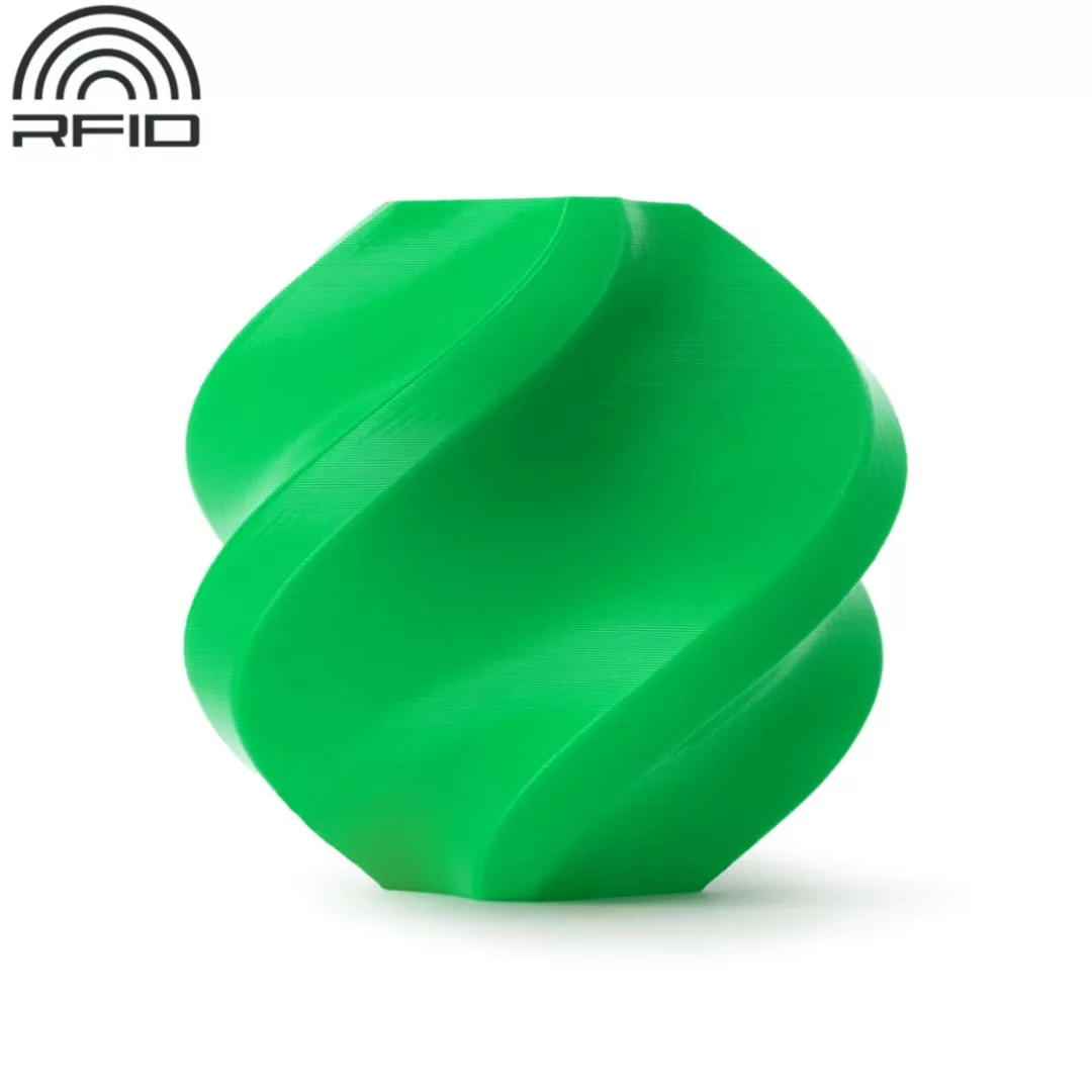 Carrete Bambu Lab con RFID Color verde - Bambu Green (10501) Facil de imprimir y amigable con principiantes. Terminación de superficie suave. Impresión inteligente con RFID* Biodegradable. Diámetro: 1.75mm +/- 0.03mm Peso neto: 1kg *Compatible con sistemas AMS Bambu Lab