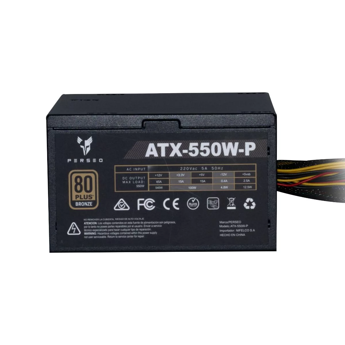Marca PERSEO Part Number ATX550W-P Modelo ATX-550W-P Potencia 550W Modular NO Certificación 80 PLUS BRONCE Rieles MONORIEL Ventilador 120MM Conectores ATX de 24 pines (x1) EPS (CPU) 4+4 pines (x1) SATA (x4) PCIe 6+2 pines (x2) Molex (x2)