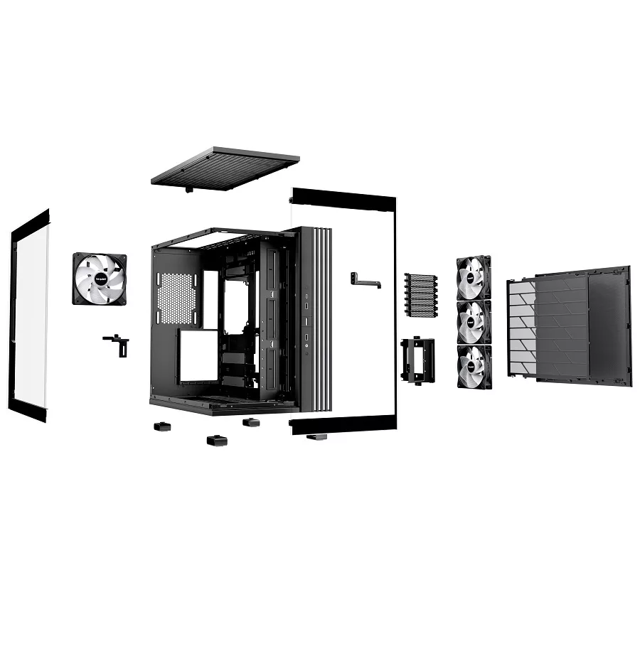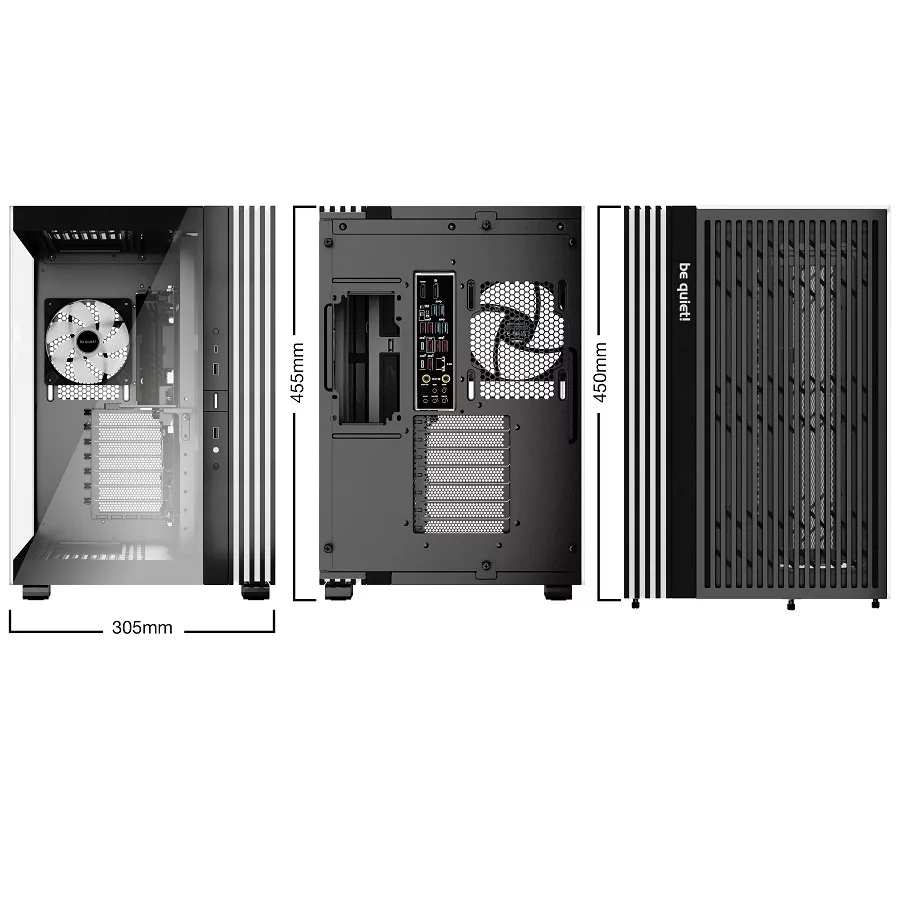Excepcional desde todos los ángulos Panel frontal y lateral acristalados para una impresionante vista de todos los componentes de su PC. Iluminación desde todos los ángulos con una enorme tira de LED ARGB. 4 ventiladores Light Wings LX 140 mm PWM para un gran flujo de aire y un funcionamiento silencioso. Cambie a disposición invertida u horizontal en cuestión de segundos gracias a un manejo intuitivo. Diseño espacioso para hasta 2 radiadores de 360 mm al mismo tiempo y una placa base ATX. Compatible con placas base con diseño de conector trasero. 2 ARGB y concentradores de ventilador con 12 conectores en total. Especificaciones: Color negro Compatibilidad para placas madre: ATX / M-ATX / Mini-ITX Dimensiones incl. patas: 450 x 305 x 435mm Peso neto: 12.1kg Formato de fuente de alimentación: ATX PS/2 Ranuras de expansión: 7 Ventilador lateral: 3 x Light Wings LX Reversed 120mm PWM Ven