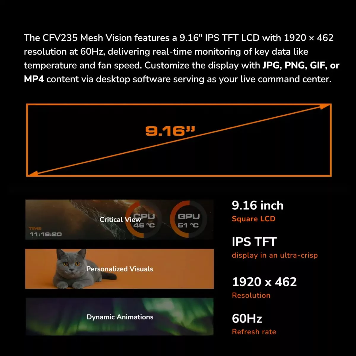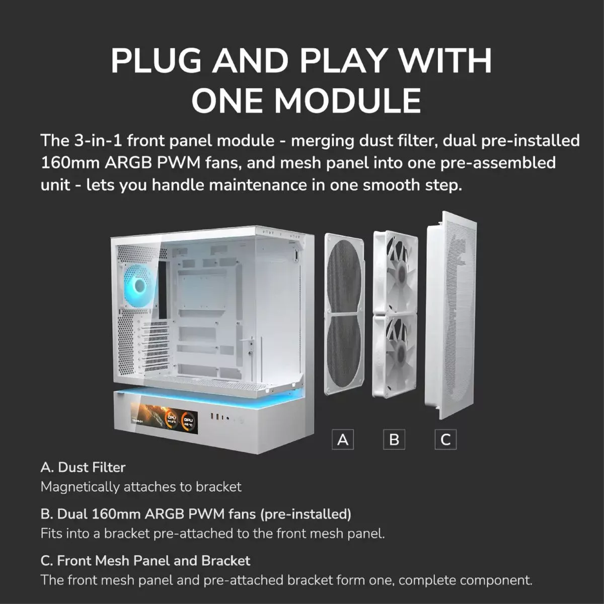 Marca Cougar Part Number 382DA40.0007 Tipo Mid Tower Iluminación LED Tamaño Motherboard Mini ITX / Micro ATX / ATX / CEB Panel I/O USB 3.2 Gen 2x2 Type-C x 1, USB 3.0 Type-A x 2, 4 Pole Headset Audio Jack x 1, RGB Button Bahías 3.5" Drive Bay x2 2+2 (converted from 3.5" drive bays) Fuente No incluida Color Black Sistema de Refriger. Pre-installed Fans 160mm ARGB PWM fan x 2 120mm ARGB PWM fan x 1 Unity 360 ARGB PWM Reversed fan x 1 Dimensiones 235 x 493 x 460 (mm) Material transp. Cristal Incluye teclado No Incluye Mouse No Incluye speakers No