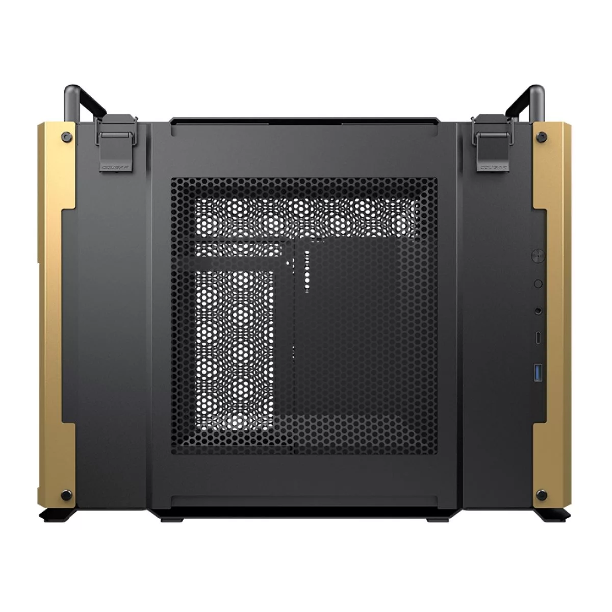 Marca Cougar Tipo Small Form Factor Iluminación No Tamaño Motherboard Mini ITX Panel I/O Type C 3.1 x1, USB3.0 x1, 4 Pole Headset Audio Jack x1, Reset Button Bahías x1 3.5" Drive Bay x2 2.5" Drive Bay Fuente No incluida Color Dorado Sistema de Refriger. 120mm black fan x 2 pre-installed Soporta 120mm / 140mm Dimensiones 175(W) x 299(H) x 403(D) (mm) Material Aluminio Material transp. No Incluye teclado No Incluye Mouse No Incluye speakers No