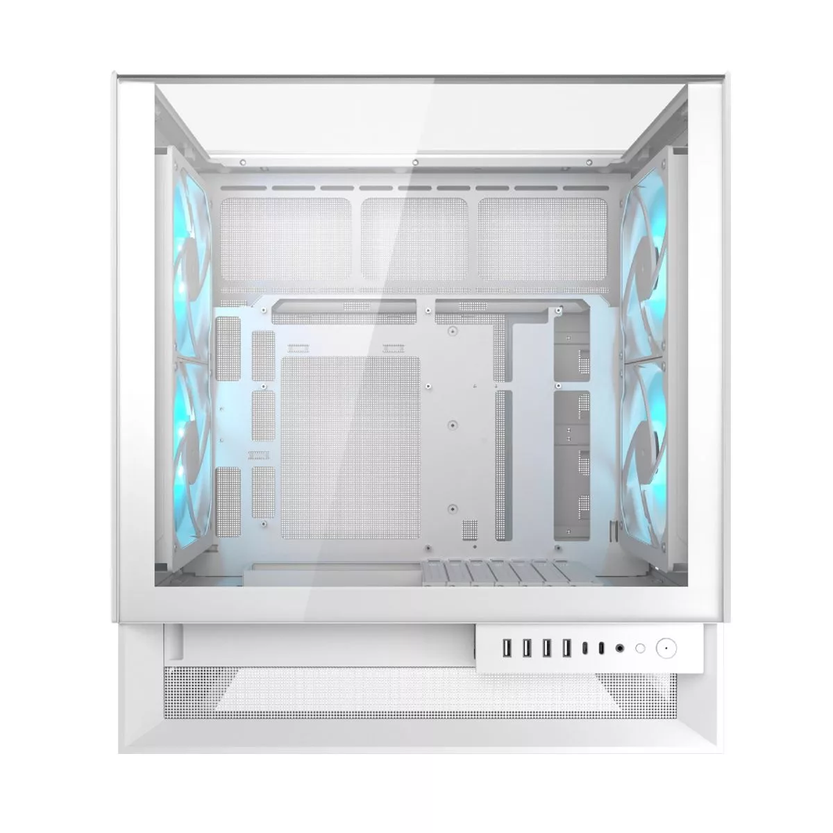 Marca Cougar Tipo Mid Tower Iluminación ARGB Tamaño Motherboard Mini ITX / Micro ATX / ATX Panel I/O USB 3.2 Gen 2 Type-C x 2, USB 3.0 Type-A x 4, 4 Pole Headset Audio Jack x 1, RGB Button Bahías x2 3.5" Drive Bay x2 2.5" Drive Bay Fuente No icluida Color Blanco Sistema de Refriger. Pre-installed Fans Front 160mm ARGB PWM fan x 2 (Forward Blade) Rear 160mm ARGB PWM fan x 2 (Reverse Blade) Maximun Number of Fans x7 Dimensiones 300(W) x 520(H) x 470(D) (mm) Material transp. Cristal Incluye teclado No Incluye Mouse No Incluye speakers No