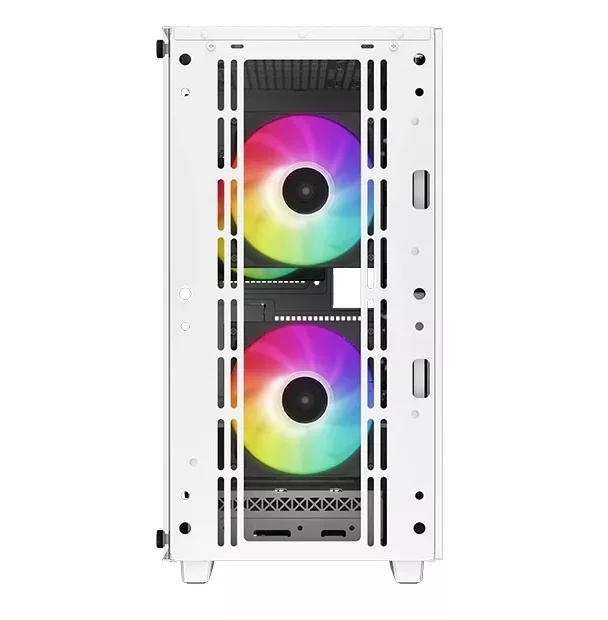 Soporte para mother: Mini-ITX / Micro-ATX Materiales: ABS+SPCC+vidrio templado Color: Blanco Tipo de fuente: ATX PS2 Puertos de expansion: 4 slots Conjunto de 3 fans RGB de 120mm Fan Posterior: 1 x 120mm LED Fans Frontales: 2 x 120mm LED Medidas: 418 × 215 × 431 mm Peso: 4.90 Kg