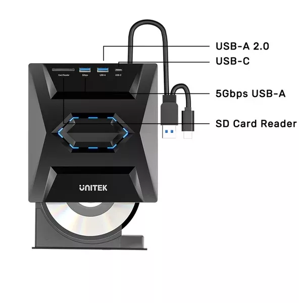 Grabadora de CD/DVD Externa Unitek con HUB USB 5 en 1