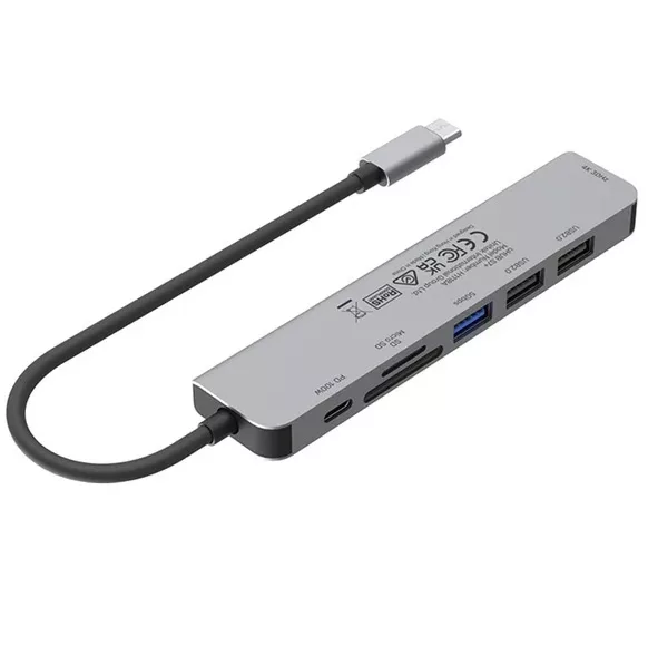 4 x USB, HDMI, SD Este adaptador USB C todo en uno cuenta con 1 puerto HDMI, 1 puerto USB 3.0, 1 lector de tarjetas SD/TF, puerto de carga PD de 100 W y 2 puertos USB 2.0, lo que permite alojar una variedad de dispositivos. Color: Gris espacial Material: Alimunio Conector: USB-C Puertos: 1 x USB-C 2 x USB-A 2.0 1 x USB-A 3.0 1 x HDMI 1.4 1 x Lector tarjeta micro SD 1 x Lector tarjeta SD Largo del cable: 16 cm Medidas: 123.8 x 28 x 10 mm