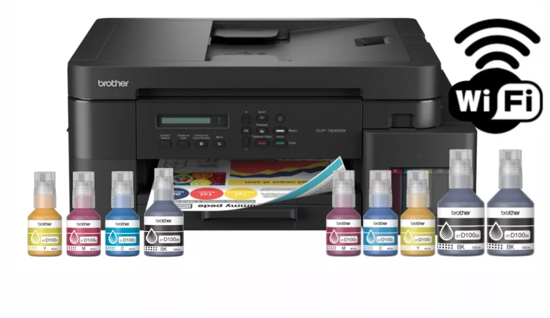 Impresora Brother Multifunción Wi-Fi DCPT830DW+ 4 Botellas de recarga Brother BTD100 Impresora Brother Multifunción Wi-Fi DCPT830DW Botella de tinta Brother BTD100Y Botella de tinta Brother BTD100M Botella de tinta Brother BTD100C Botella de tinta Brother BTD100BK