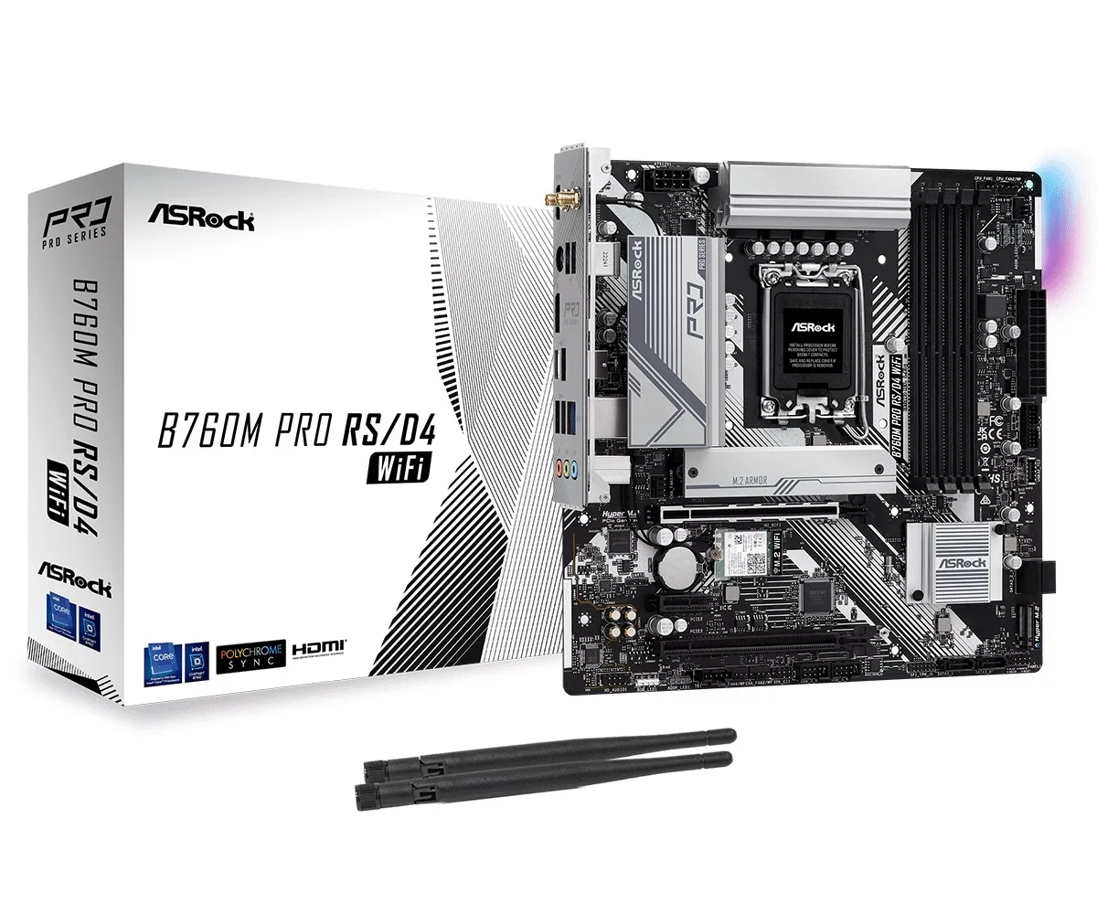 Socket 1700 Intel 12a, 13a, 14a gen. DDR5. RGB Formato: Micro ATX Compatibilidad: Procesadores Intel Core 14th, 13th, 12th Gen Socket: LGA1700 Chipset: Intel B760 Memoria: DDR5 (Dual channel) hasta 128GB Almacenamiento: 2 x Hyper M.2 y 4 x SATA de (6 Gb/s) Graficos: Intel Xe Graphics Architecture (Gen 12) Audio: Realtek High Definition 7.1 integrado PCIe 4.0 X16 - 3.0 X1 Conector RGB Módulo WiFi 802.11ax Wi-Fi 6E Conector de alimentacion: ATX de 24 pines Incluye 2 Antenas ASRock WiFi 2.4/5/6 GHz Conectores: 1 x HDMI 1 x DisplayPort 1.4 2 x Puntos de montaje para antenas 1 x PS/2 (teclado/mouse) 3 x Puerto USB 3.2 Gen2 Type-A (10 Gb/s) 1 x Puerto USB 3.2 Gen2 Type-C (10 Gb/s) 2 x Puertos USB 2.0 1 x RJ-45 LAN HD Audio Jacks: Linea de entrada / Speaker delantero / Microfono