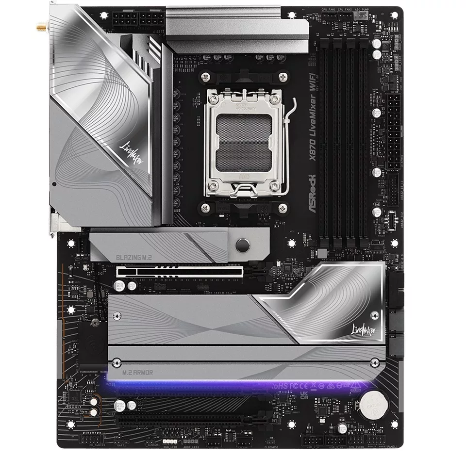 Socket AMD Ryzen AM5 DDR5 Formato: Micro ATX Compatibilidad: Procesadores AMD AM5 Ryzen Series 7000, 8000 y 9000 Socket: AM5 Ryzen Chipset: AMD X870 Memoria: DDR5 (dual channel) Almacenamiento: 2 x Blazing M.2, 2 x Hyper M.2, 2 x Sata 3 Graficos: AMD RDNA Audio: Realtek High Definition 7.1 integrado PCIe 3.0 X16 Conector RGB 2 Antenas Wifi 2.4 / 5 / 6 GHz Conector de alimentacion: ATX de 24 pines Conectores: 2 x Puertos de antena 1 x puerto HDMI 1 x Puerto de salida Óptico SPDIF 2 x USB4 Type-C Ports (40 Gb/s)* 1 x puerto USB 3.2 Gen1 Type-C 7 x USB 3.2 Gen1 Type-A Ports (USB32_34 are Puertos para juegos Lightning. USB32_56 Soporta Ultra Poder USB.)** 6 x puertos USB 2.0 1 x Puerto RJ-45 1 x Interruptor Flashback del BIOS 1 x Línea de salida Jack (Gold Audio Jack) 1 x Línea de entrada de micrófono Jack (Gold Audio Jack)