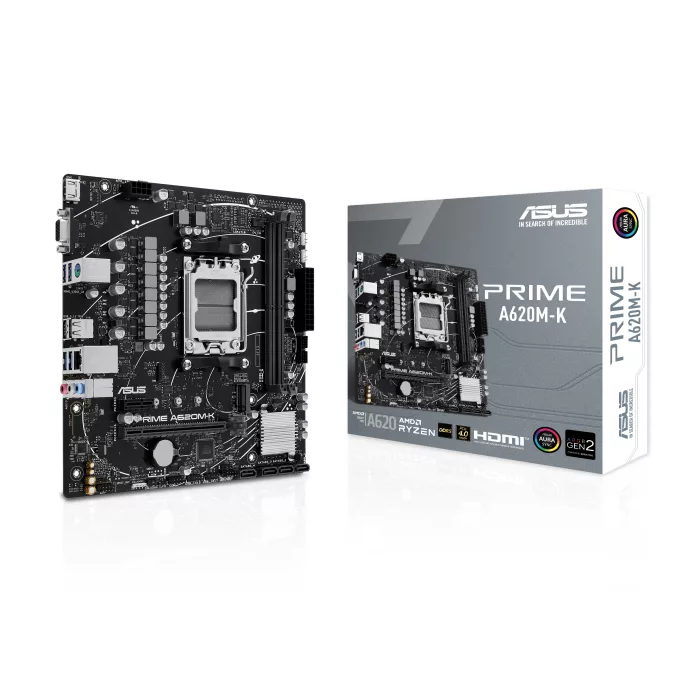 Socket AMD Ryzen AM5 Formato: Micro ATX Compatibilidad: AMD Ryzen 9000/8000/7000 Socket: AM5 Chipset: AMD A620 Memoria: DDR5 (Dual channel) 2 Slots (soporta hasta 96GB) Almacenamiento: 1 x M.2 y 4 x SATA III (6 Gb/s) Graficos: Soporta HDMI 2.1 (4K-60HZ) Audio: Realtek 7.1 Surround Sound High Definition integrado Conector de alimentacion: 1 x 8 pines / 1 x 24 pines Aura Sync RGB Lighting Slots de expansion: 1 x PCIe 3.0 x1 1 x PCIe 4.0 x16 (x8/x4 mode) 1 x PCIe 4.0 x16 (x16 mode) Conectores: 1 x HDMI 1 x VGA 4 x USB 3.2 Gen 1 (5G) 2 x USB 2.0 1 x Realtek 1Gb Ethernet 3 x Audio jacks 1 x PS/2 Keyboard/Mouse combo