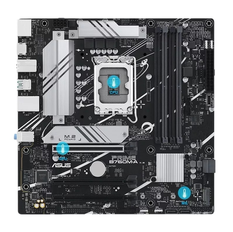 Motherboard Intel B760 (LGA 1700) mATX con PCIe 4.0, DDR5, dos puertos M.2, Realtek 2.5Gb Ethernet, DisplayPort, Dual HDMI, SATA 6 Gbps, USB 3.2 Gen 2 trasero, USB 3.2 Gen 1 Type-C frontal, Aura Sync.